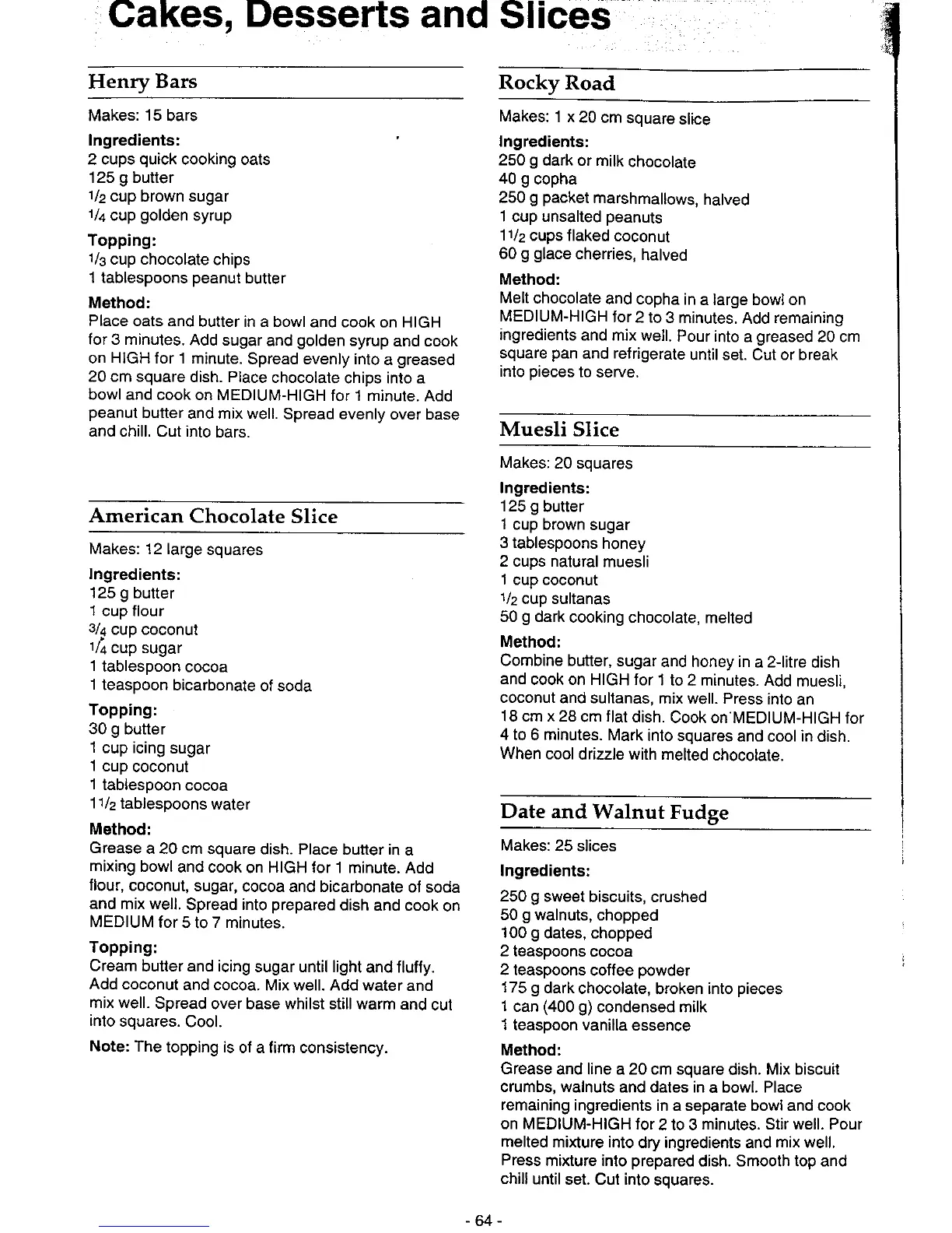 Panasonic NN-6803 - Cakes, Desserts, and Slices (cont.); Henry Bars and American Chocolate Slice; Rocky Road, Muesli Slice, and Date Walnut Fudge
