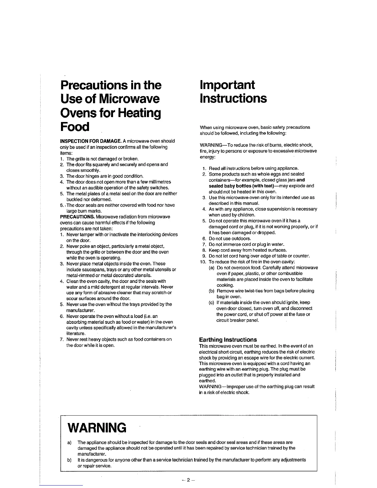 Panasonic NN-6808 - Precautions in the Use of Microwave Ovens for Heating Food; Inspection for Damage; Precautions Against Microwave Radiation; Important Instructions for Safe Operation