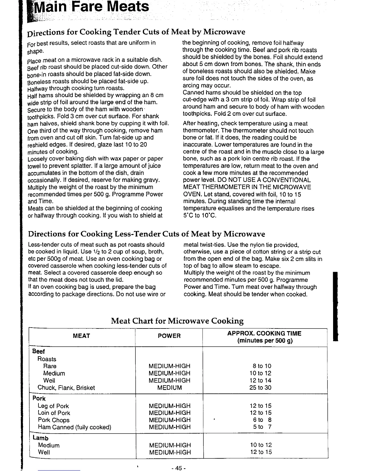 Panasonic NN-6853 - Main Fare Meats: Tender Cuts; Cooking Tender Meats by Microwave; Meat Cooking Time Chart