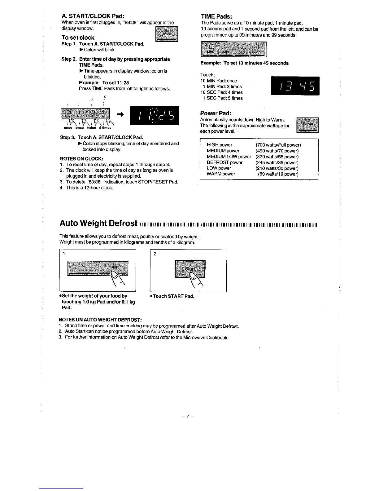 Panasonic NN-7808 - Clock and Time Settings; Setting the Clock; Using TIME Pads; Power and Defrost Functions