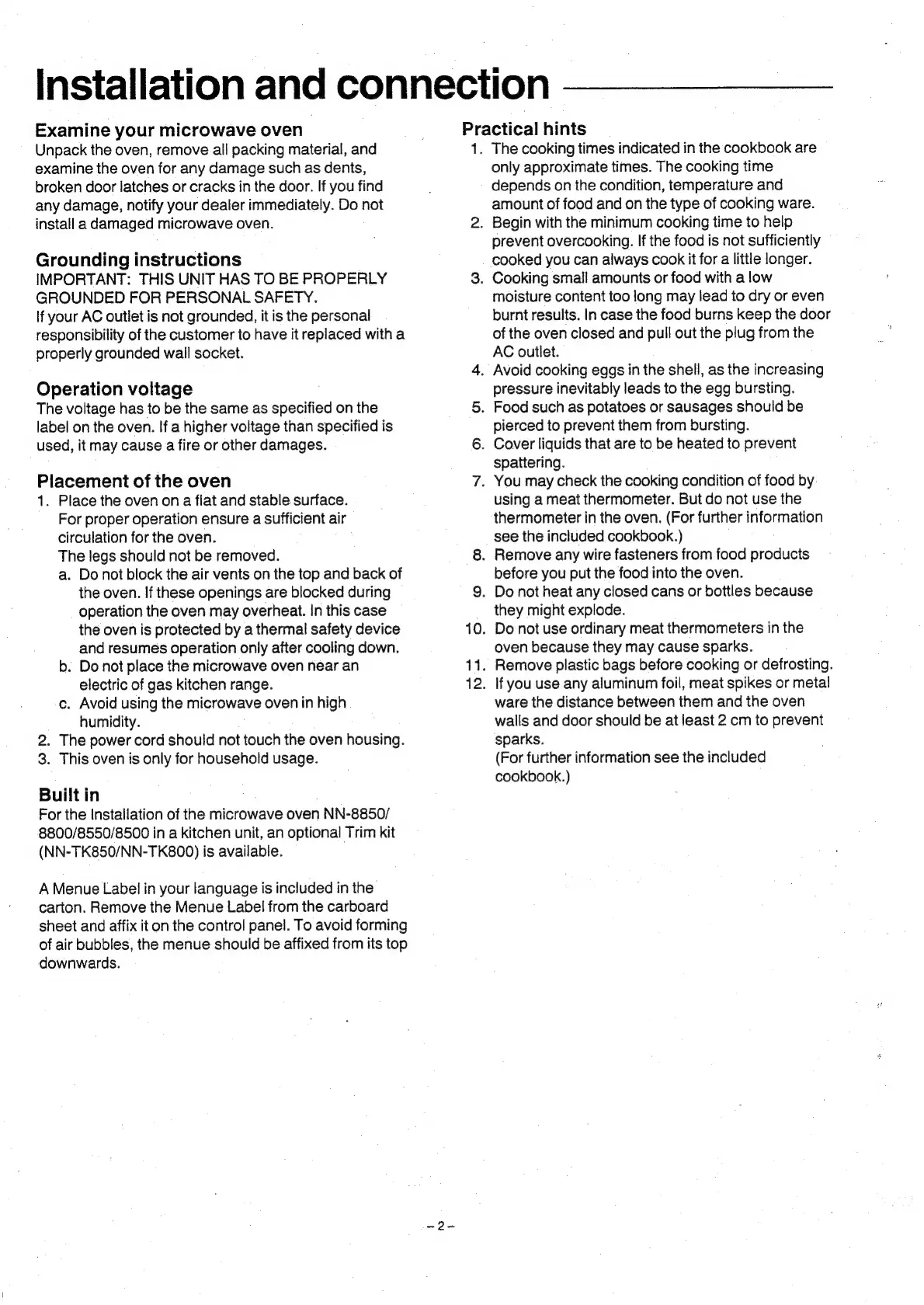 Panasonic NN-8550 - Installation and Connection; Examine Your Microwave Oven; Grounding Instructions; Operation Voltage