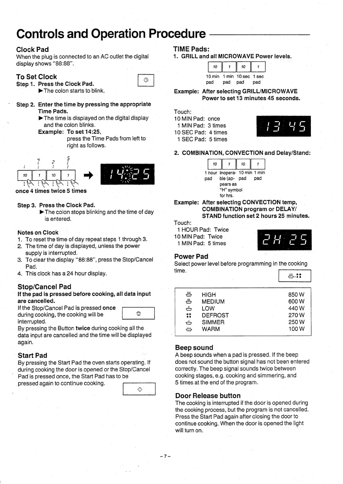 Panasonic NN-8550 - Controls and Operation Procedure; Clock Pad Operations; Stop;Cancel and Start Pads; Time and Power Pads