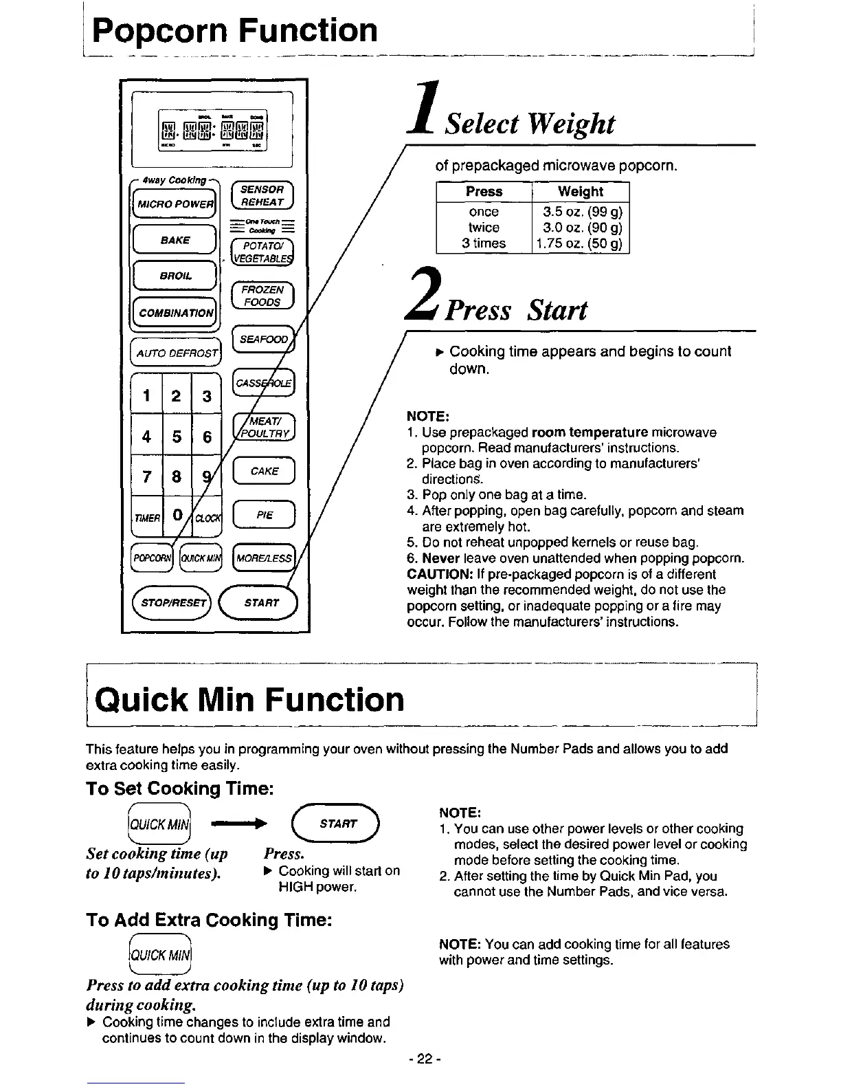 Panasonic NN-9804 - Popcorn Function; Quick Min Function; To Set Cooking Time; To Add Extra Cooking Time