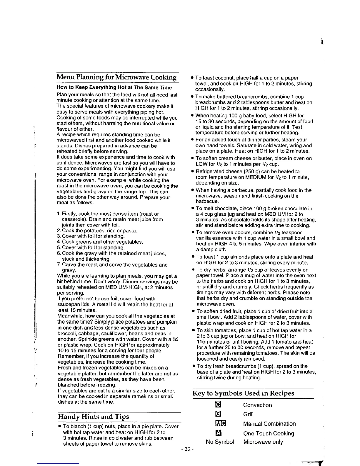 Panasonic NN-9853 - Menu Planning for Microwave Cooking; Handy Hints and Tips; Key to Symbols Used in Recipes