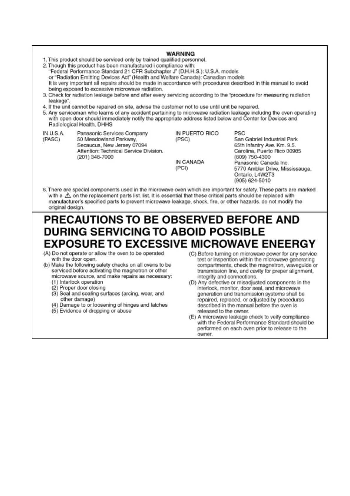 Panasonic NN-C994S - Microwave Exposure Precautions; Pre-Service Safety Checks; Pre-Power-On Component Checks; Microwave Leakage Testing