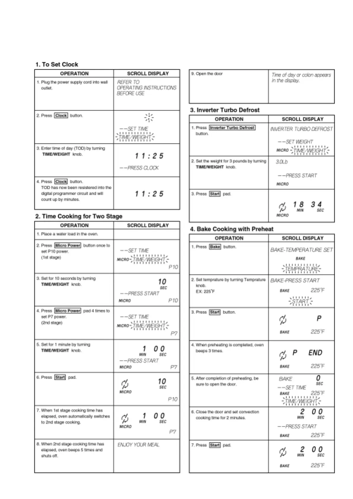 Panasonic NN-C994S - Operation and Test Procedures; Setting the Clock; Two-Stage Time Cooking; Inverter Turbo Defrost Operation