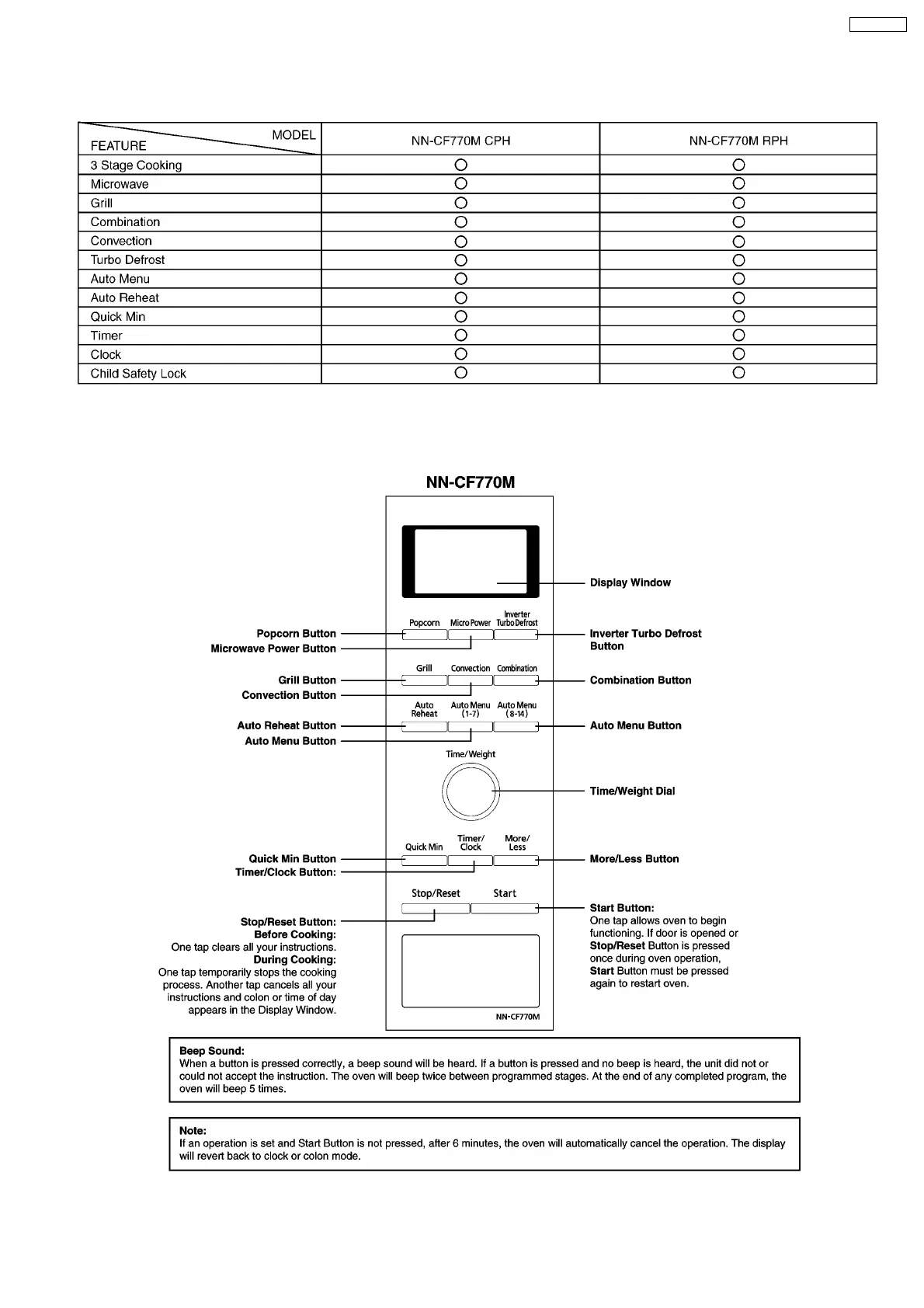 Panasonic NN-CF770M CPH - Feature Chart; Control Panel