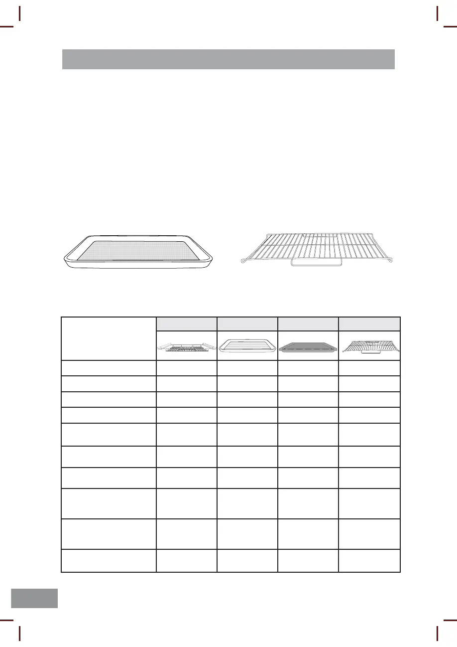 The following chart shows correct use of the accessories in the oven