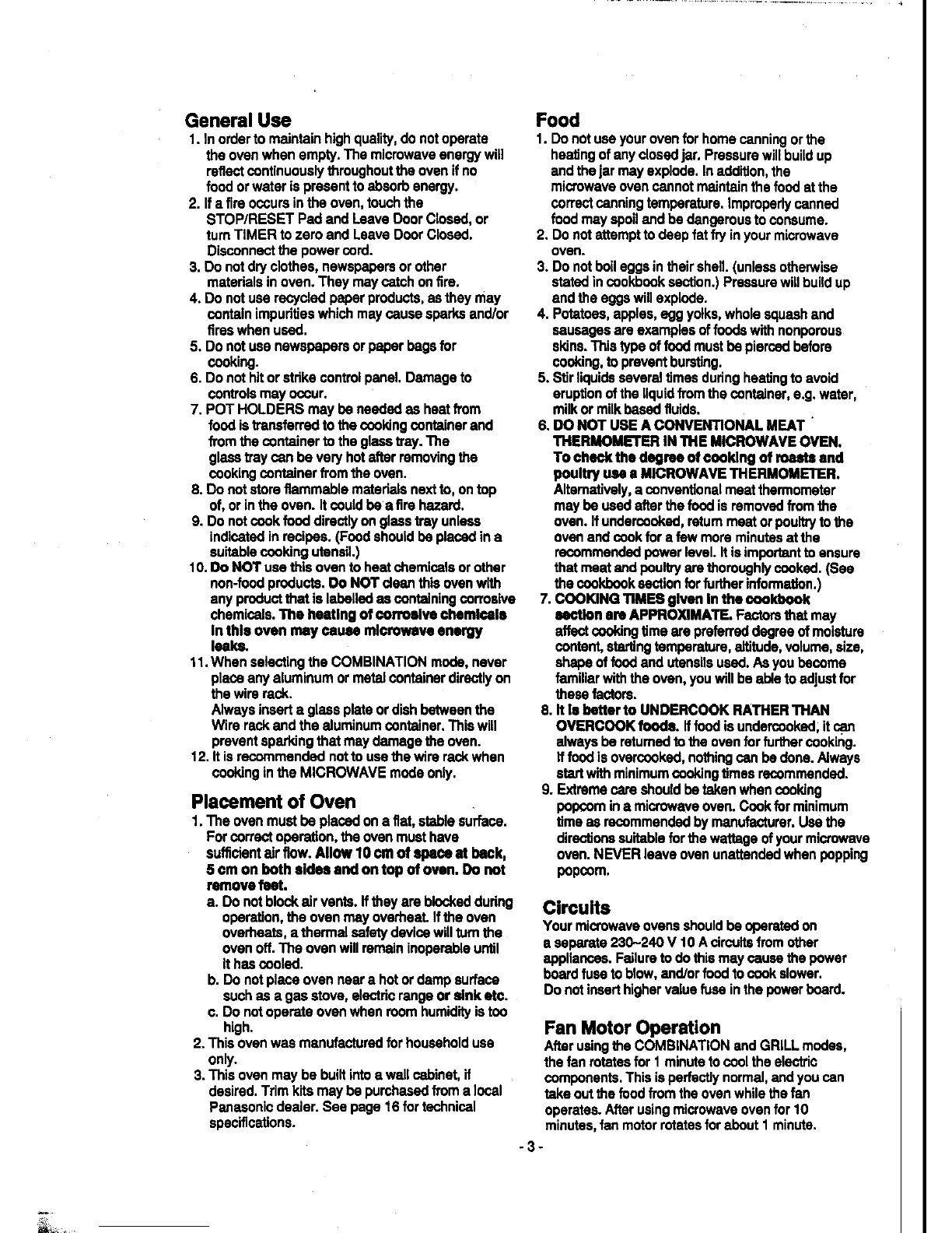 Panasonic NN-K652 - Microwave Oven Operation Basics; General Use and Safe Operation; Food Handling and Safety Guidelines; Oven Placement and Electrical Requirements