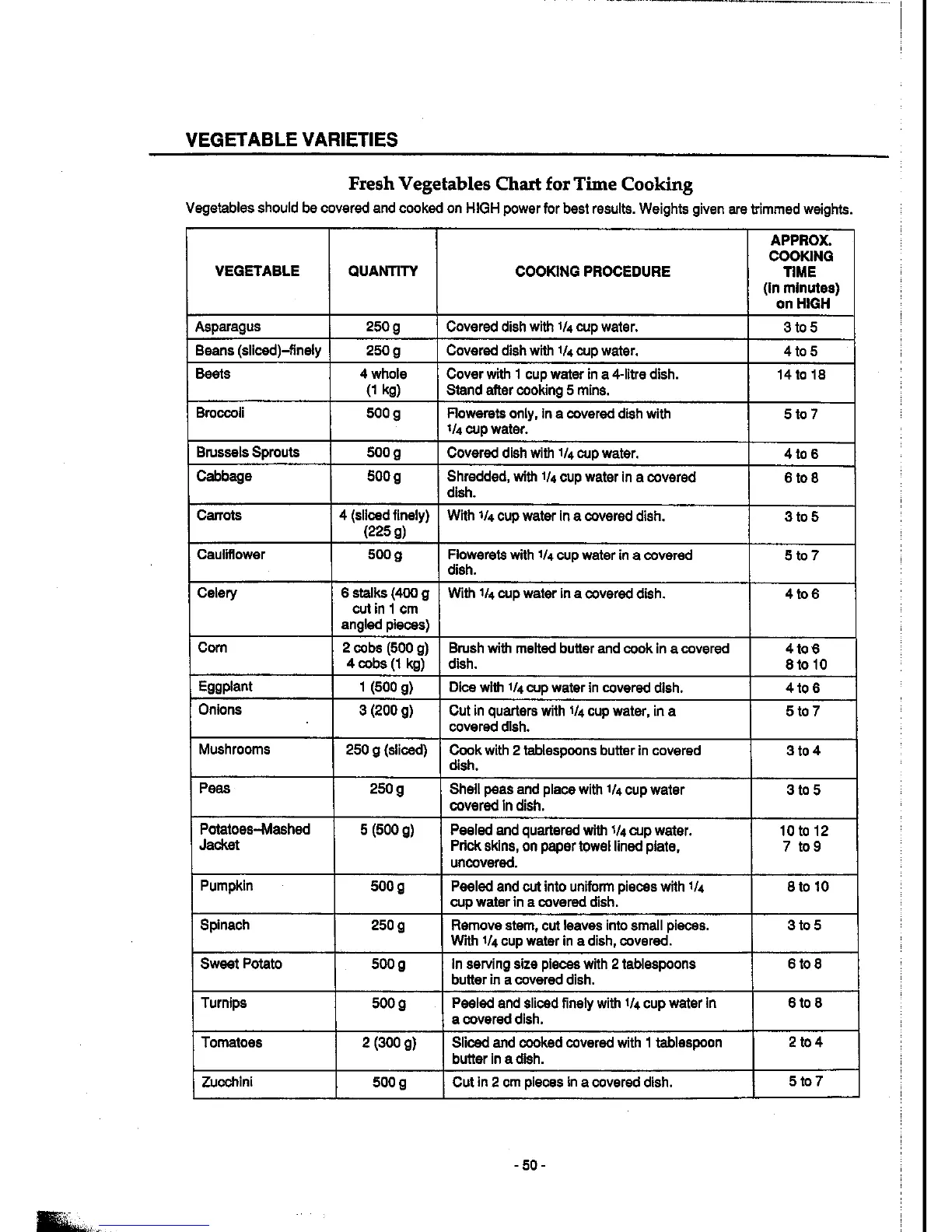 Panasonic NN-K652 - Fresh Vegetables Chart for Time Cooking