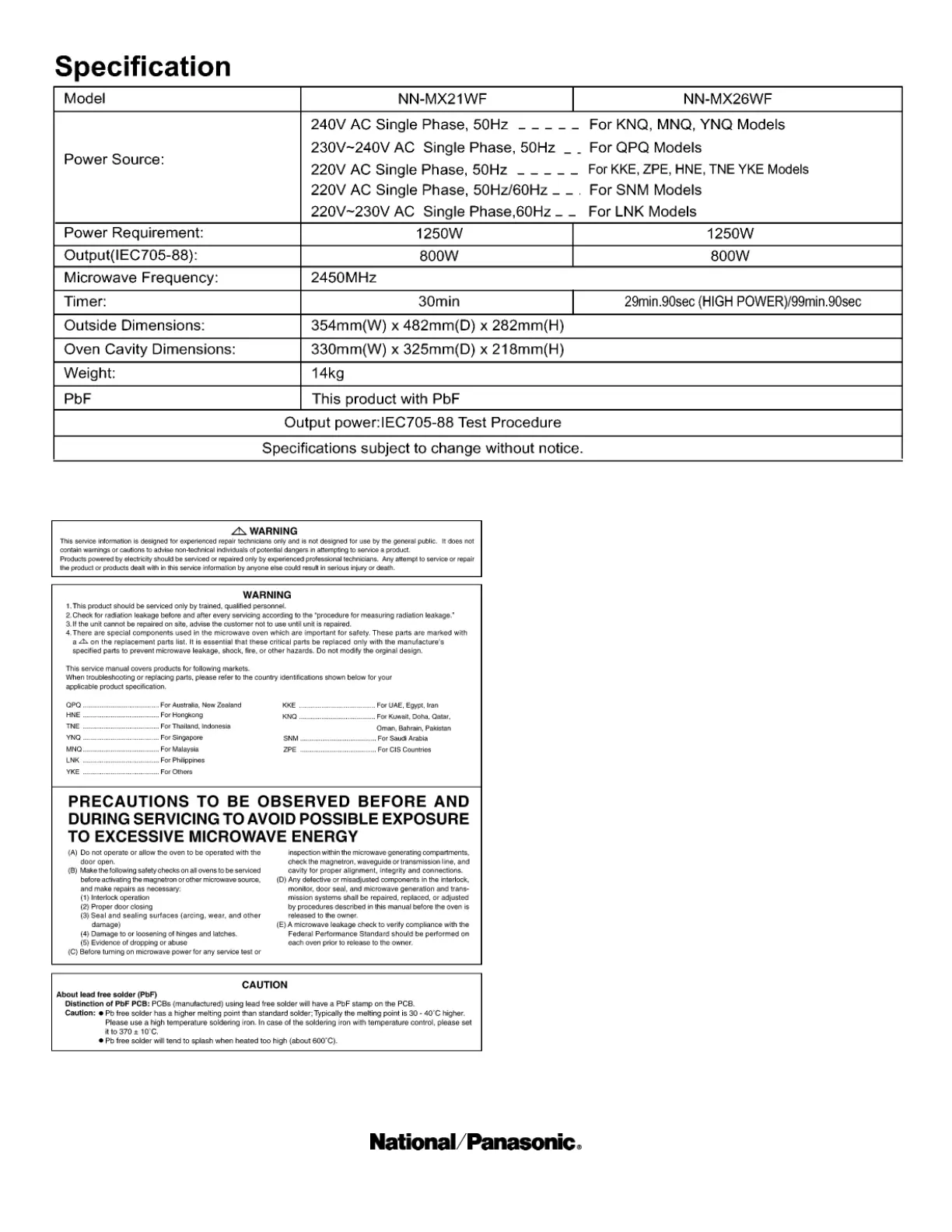 Panasonic NN­-MX21WF - Product Specifications; Key Product Specifications; Safety and Service Procedures; Microwave Radiation Exposure Safety