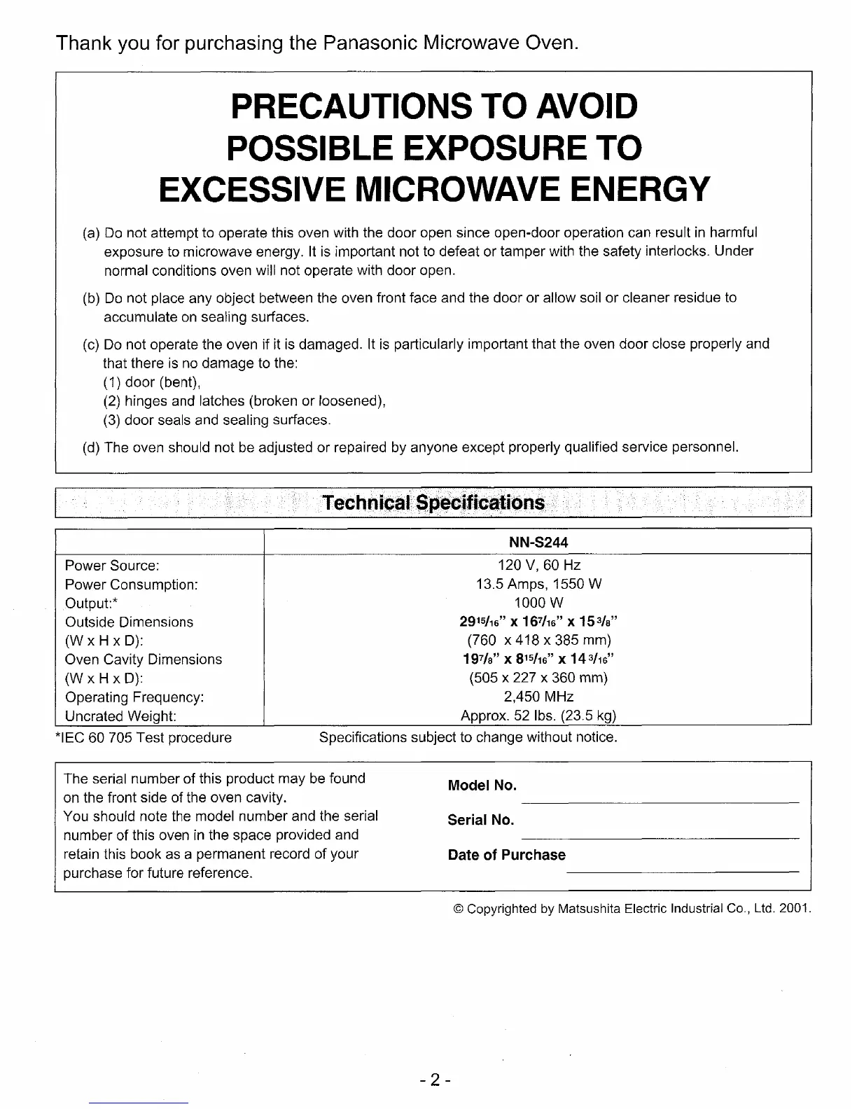 Panasonic NN-S244BL - Microwave Energy Exposure Safety; Technical Specifications