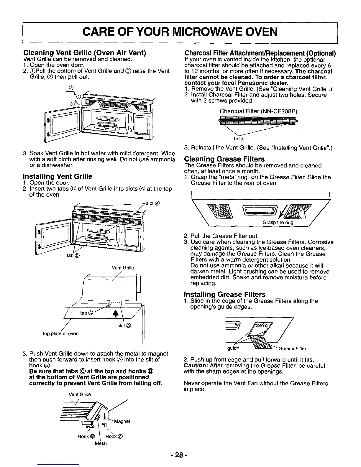 Panasonic NN-S262BF - Component Cleaning and Filter Replacement; Vent Grille and Grease Filter Maintenance; Charcoal Filter Replacement