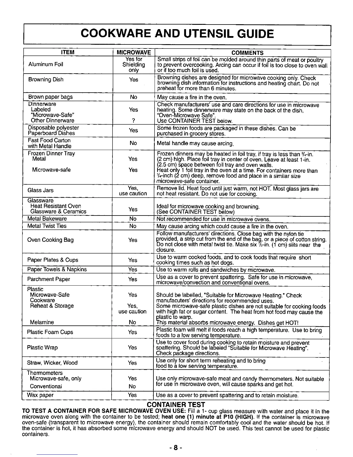 Panasonic NN-S262BF - Cookware and Utensil Guide; Container Safety Test