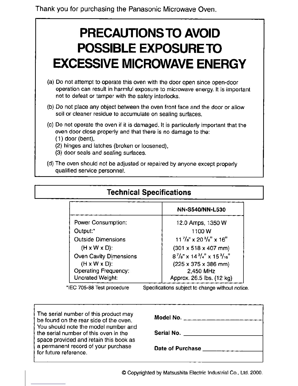 Panasonic NN-S540WF - Microwave Oven Safety Precautions; Technical Specifications