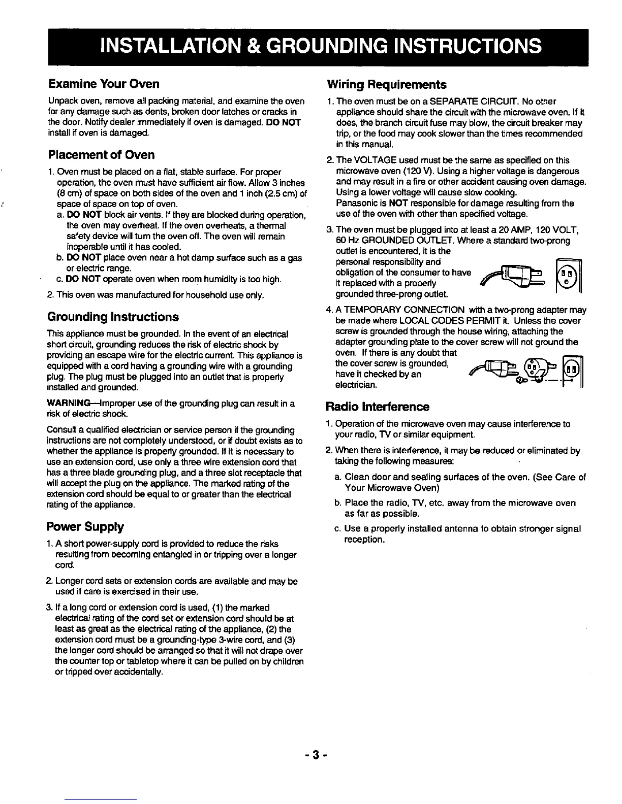 Panasonic NN-S548BA - Installation and Grounding Instructions; Oven Examination and Placement; Grounding, Power, and Wiring Requirements