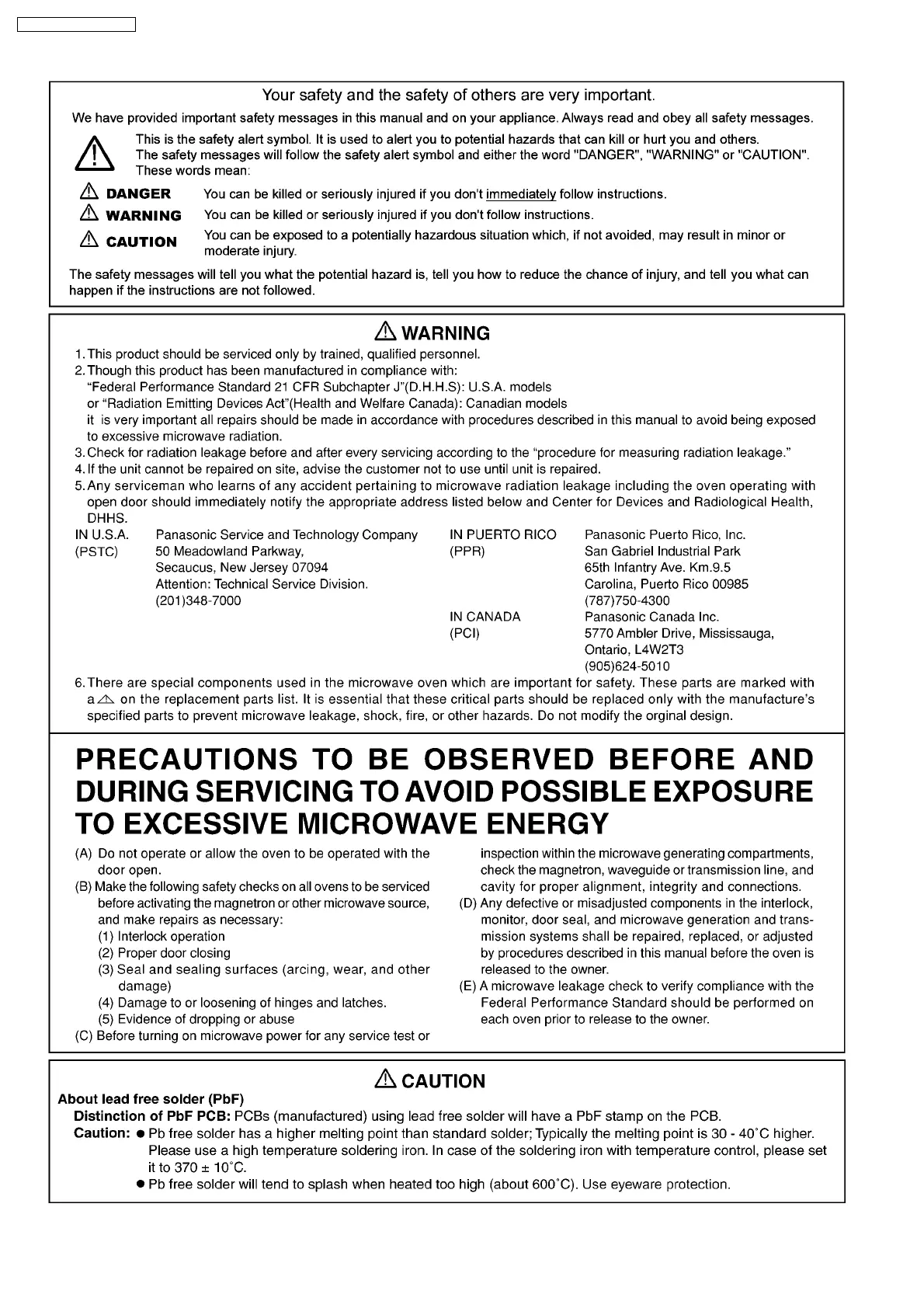 Panasonic NN-SD291S - PRECAUTIONS TO BE OBSERVED BEFORE AND DURING SERVICING TO AVOID POSSIBLE EXPOSURE TO EXCESSIVE MICROWAVE ENERGY