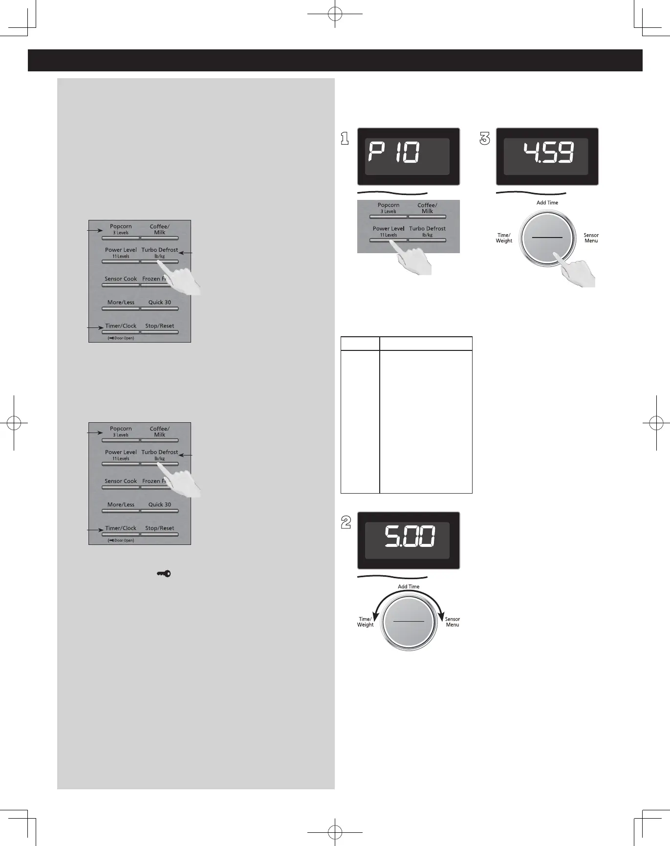 Press Turbo Defrost - Timer/Clock - Popcorn in sequence, a