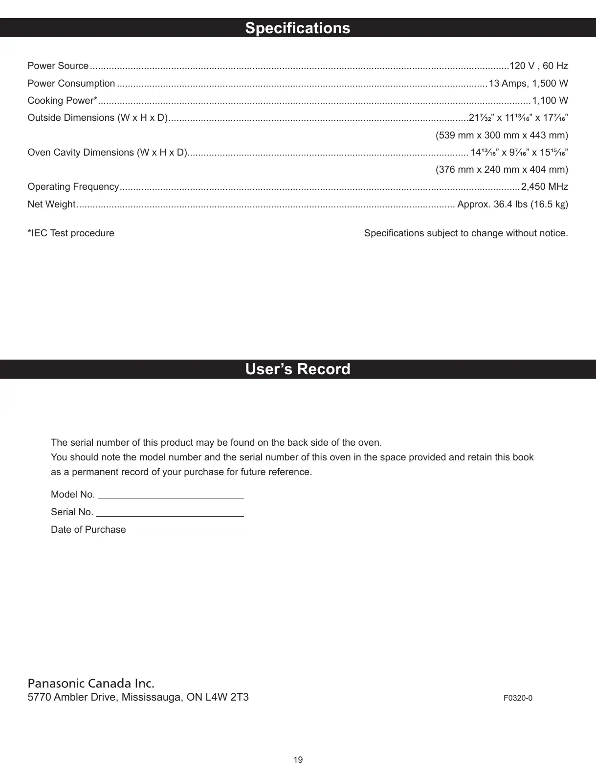 You should note the model number and the serial number of this oven in the space provided and retain this book