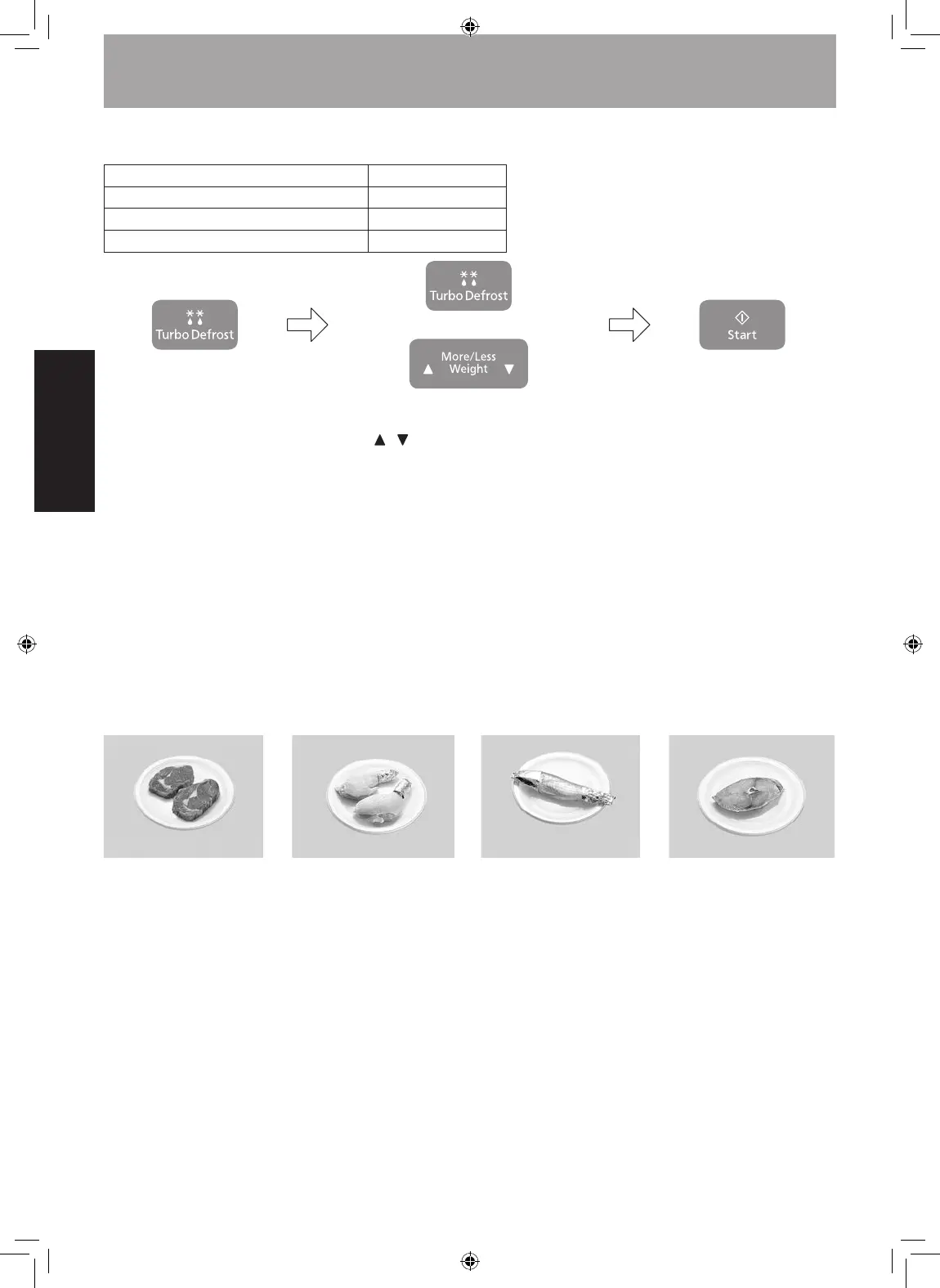 This feature allows you to defrost meat, poultry and seafood automatically by setting the weight.