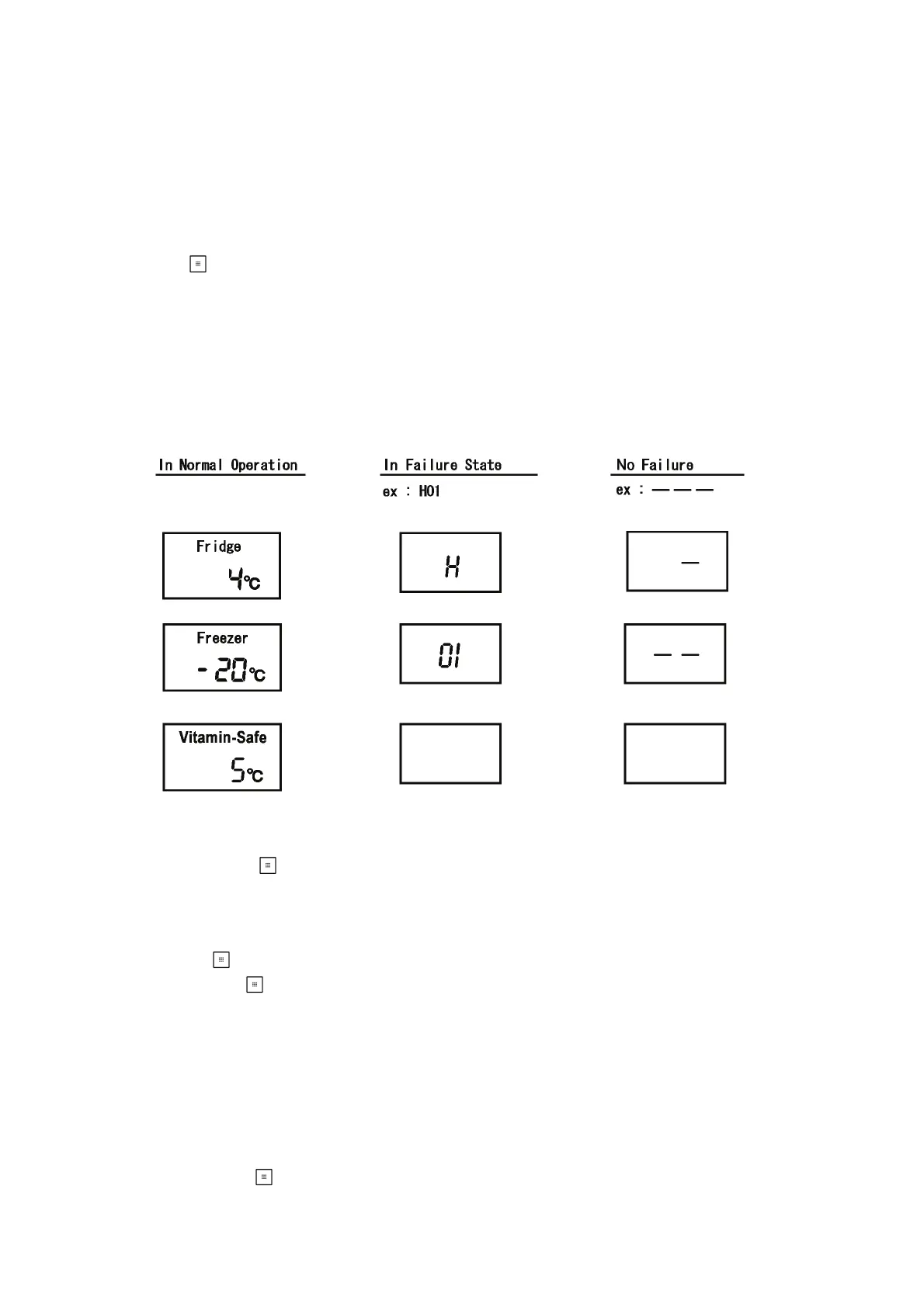 When there is not any trouble/failure, “-” is displayed at Fridge temperature area and “--” is displayed at Freezer temperature display