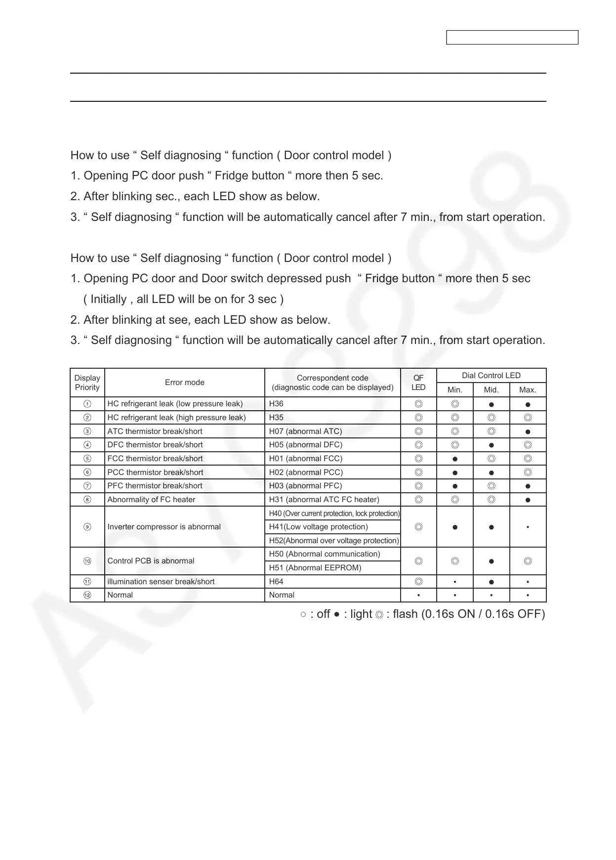 When abnormal is cased in the refrigeator, the sign is displayed on LED as below chart