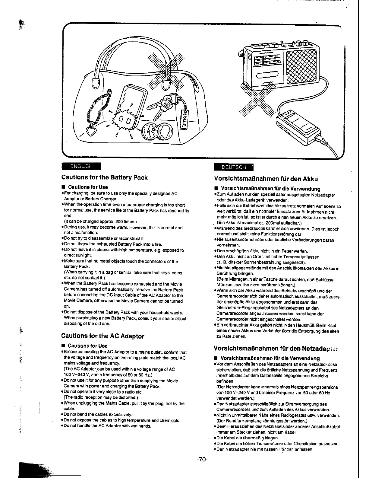Panasonic NV-A1E - Accessory Cautions; Cautions for the Battery Pack; Cautions for the AC Adaptor