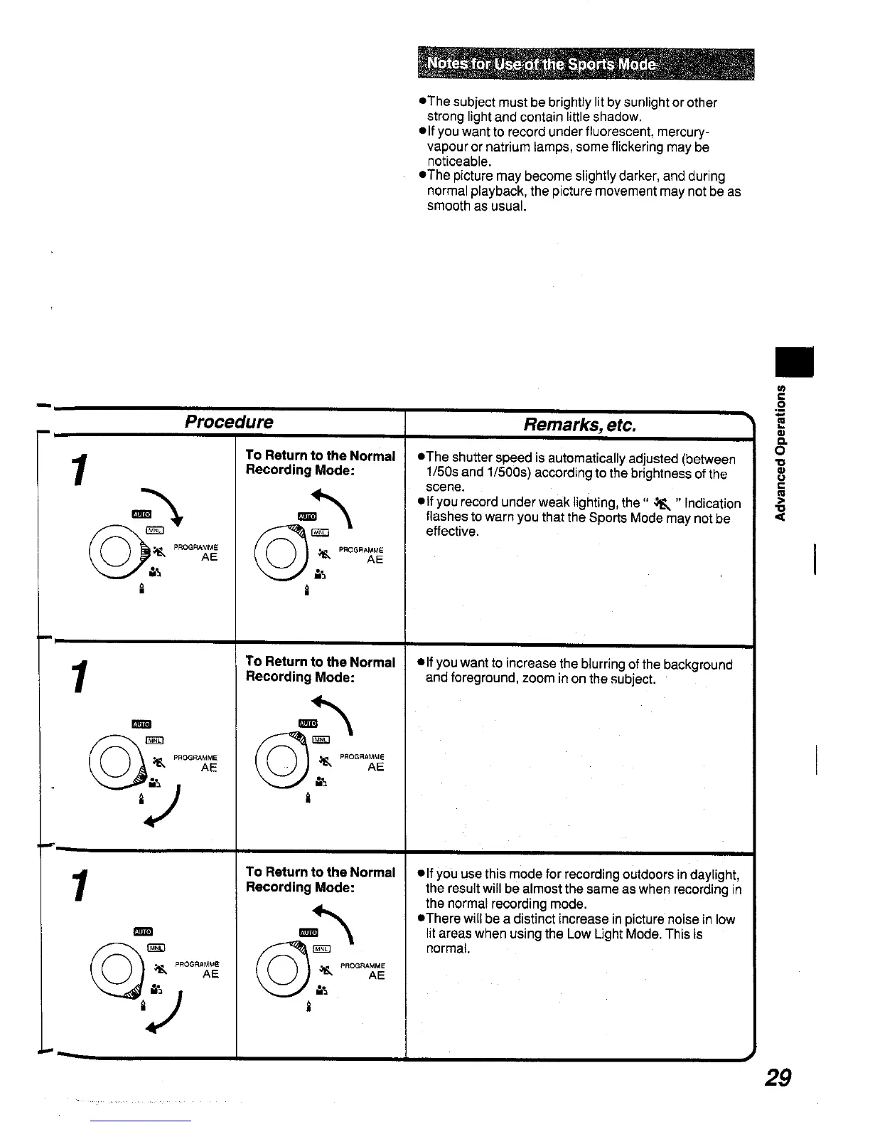 Panasonic NV A3A - Notes for Use of the Sports Mode; To Return to the Normal Recording Mode