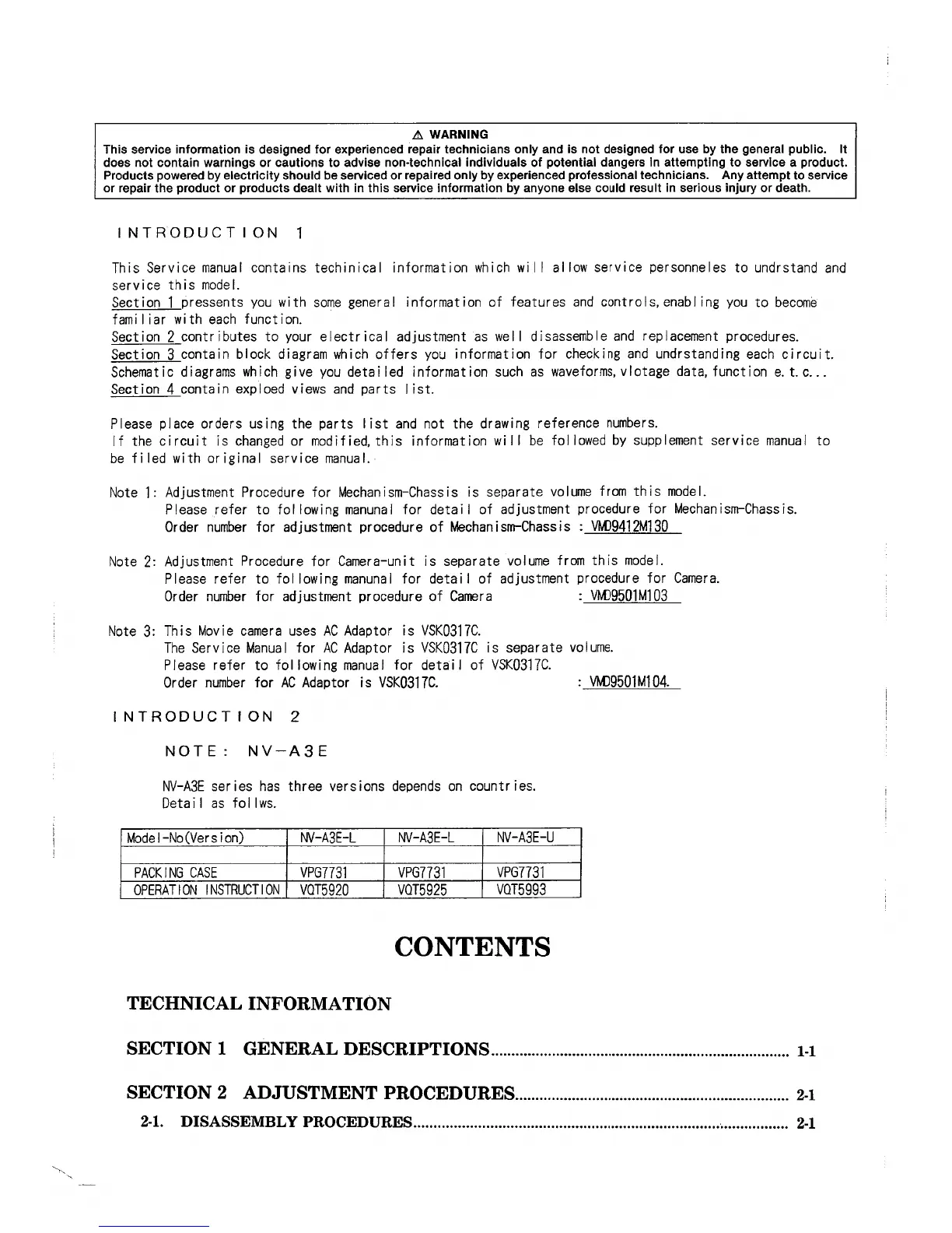 Panasonic NV-A3E - Section 1 General Descriptions; Section 2 Adjustment Procedures; Section 3 Block Diagrams and Schematic Diagrams; Section 4 Exploded Views and Parts List