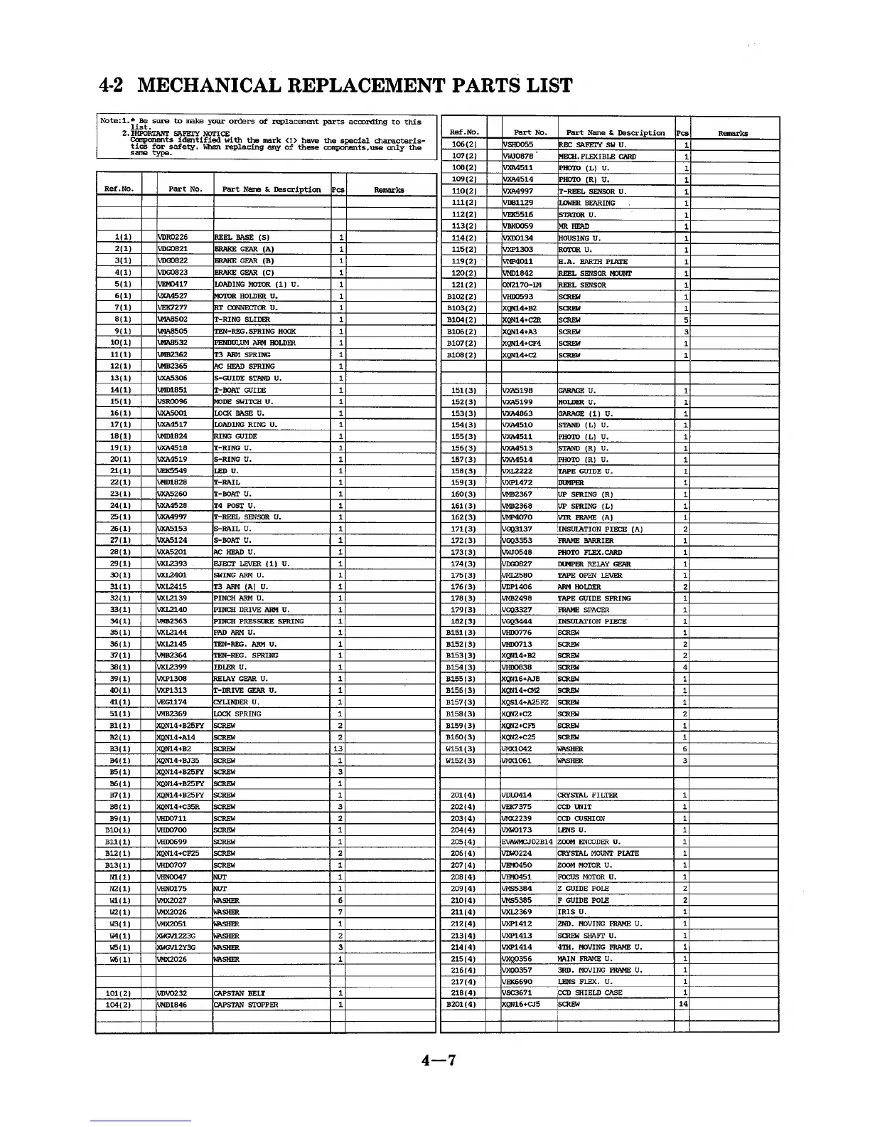 Panasonic NV-A3E - Mechanical Replacement Parts List