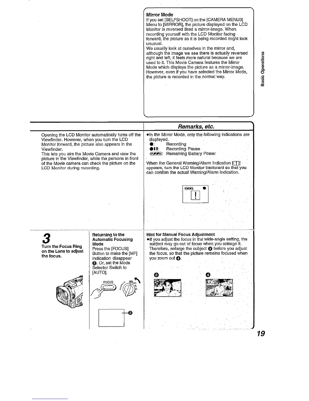 Panasonic NV-DA1B - Mirror Mode; Returning to the Automatic Focusing Mode; Hint for Manual Focus Adjustment