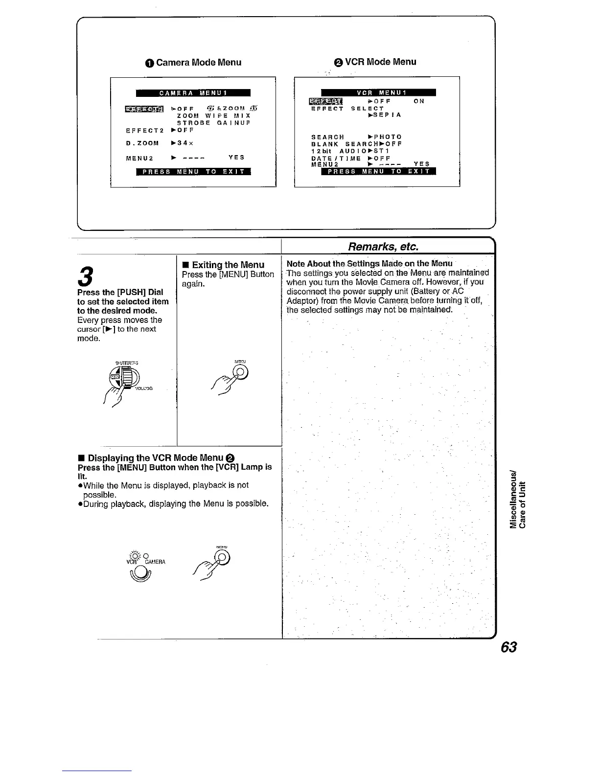 Panasonic NV-DA1B - Displaying the VCR Mode Menu; Exiting the Menu
