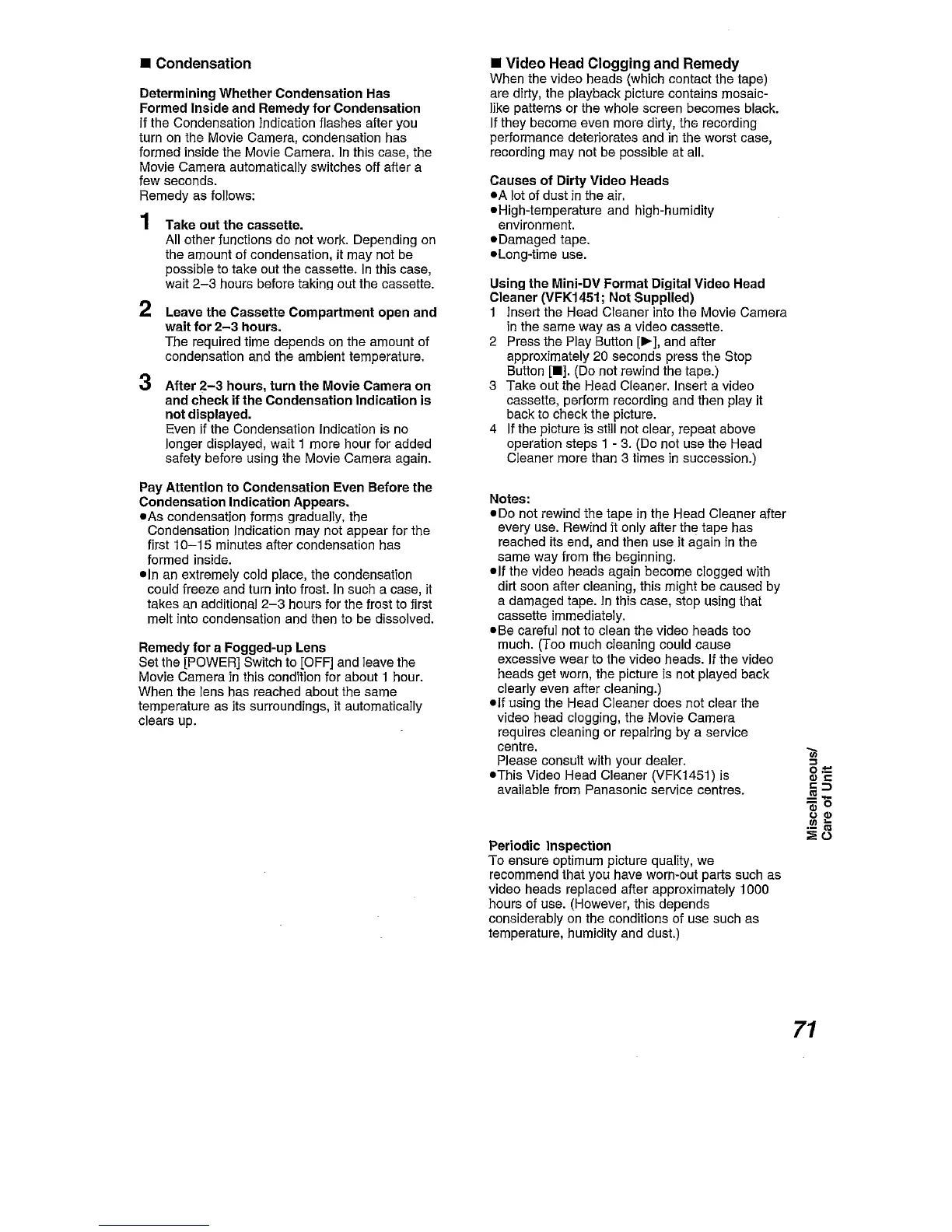 Panasonic NV-DA1B - Condensation; Video Head Clogging and Remedy; Periodic Inspection