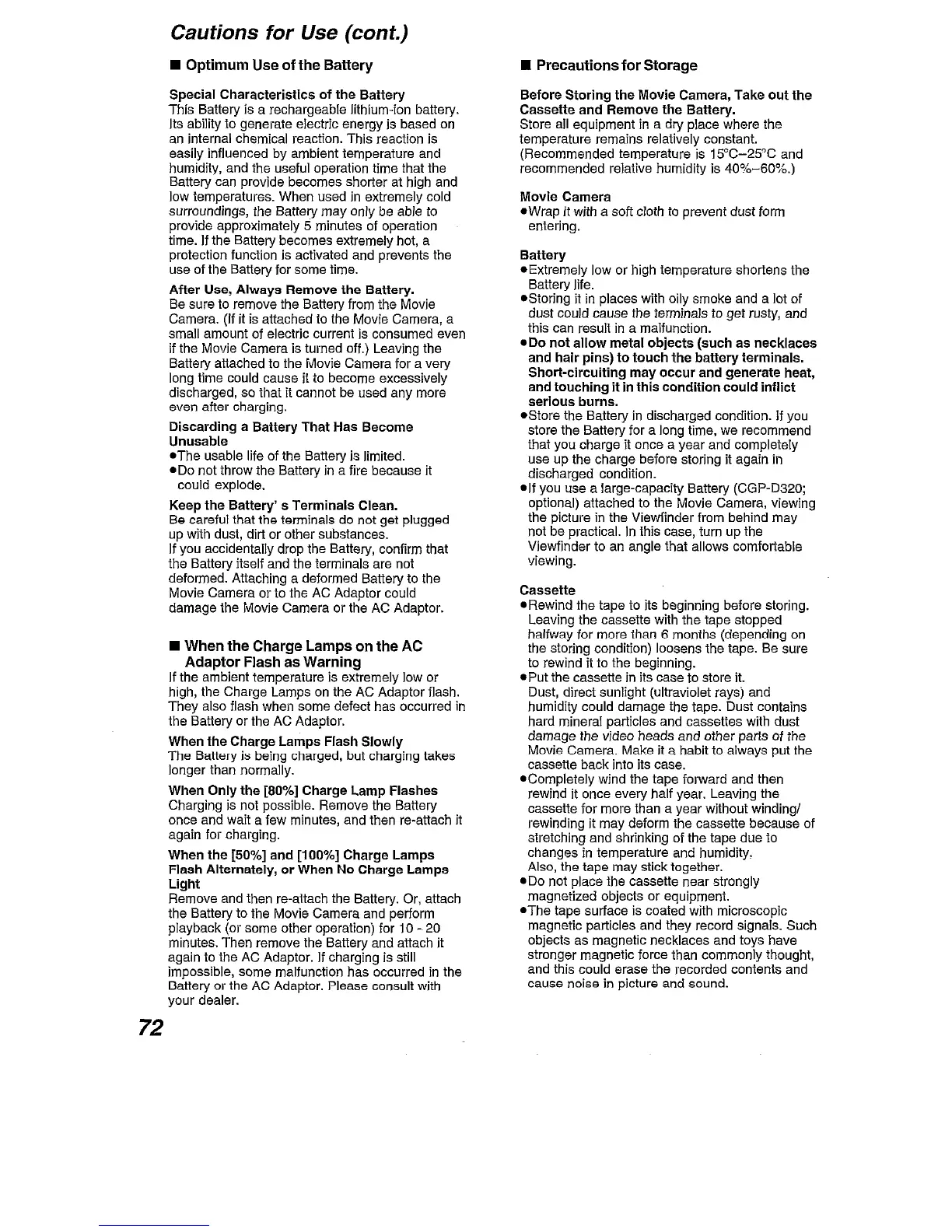 Panasonic NV-DA1B - Optimum Use of the Battery; Precautions and Storage