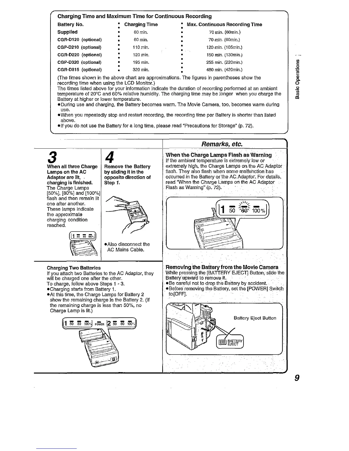 Panasonic NV-DA1B - Charging Time and Maximum Time for Continuous Recording; When the Charge Lamps Flash as Warning; Removing the Battery from the Movie Camera; Charging Two Batteries