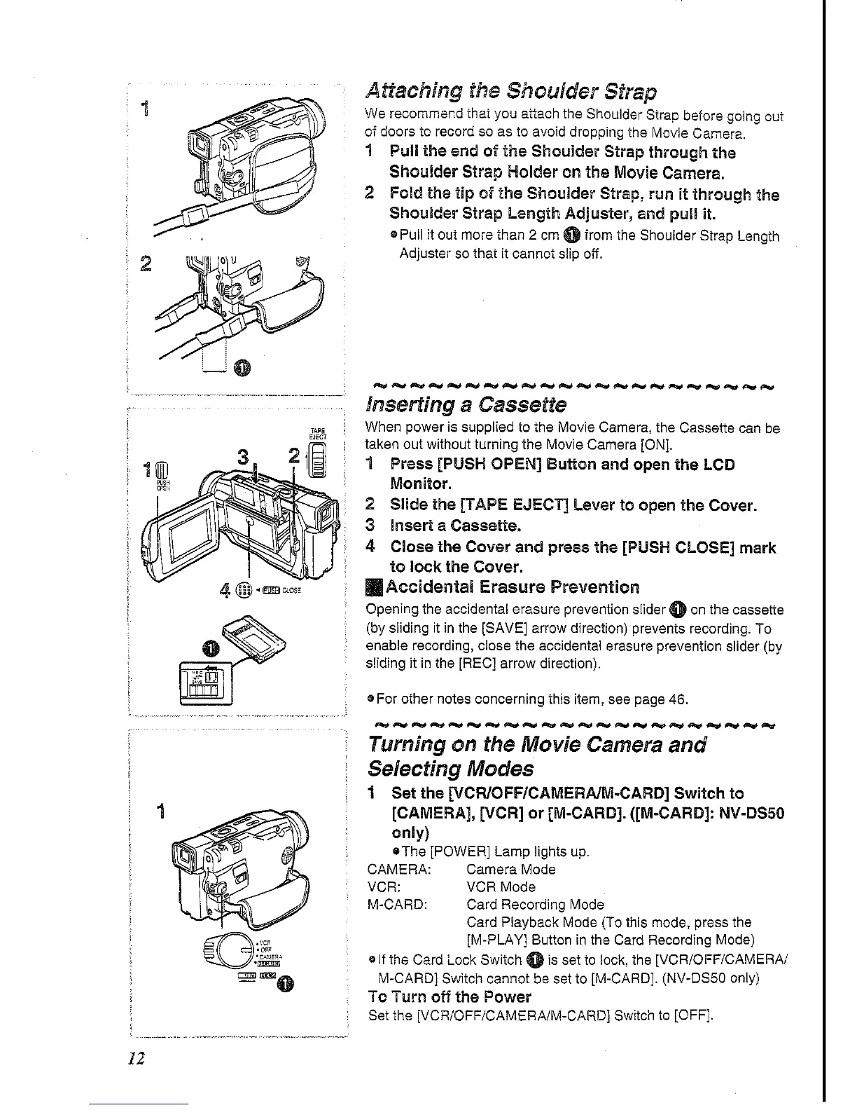 Panasonic NV-DS30 - Camera Setup and Modes; Attaching the Shoulder Strap; Inserting a Video Cassette; Selecting Camera Modes