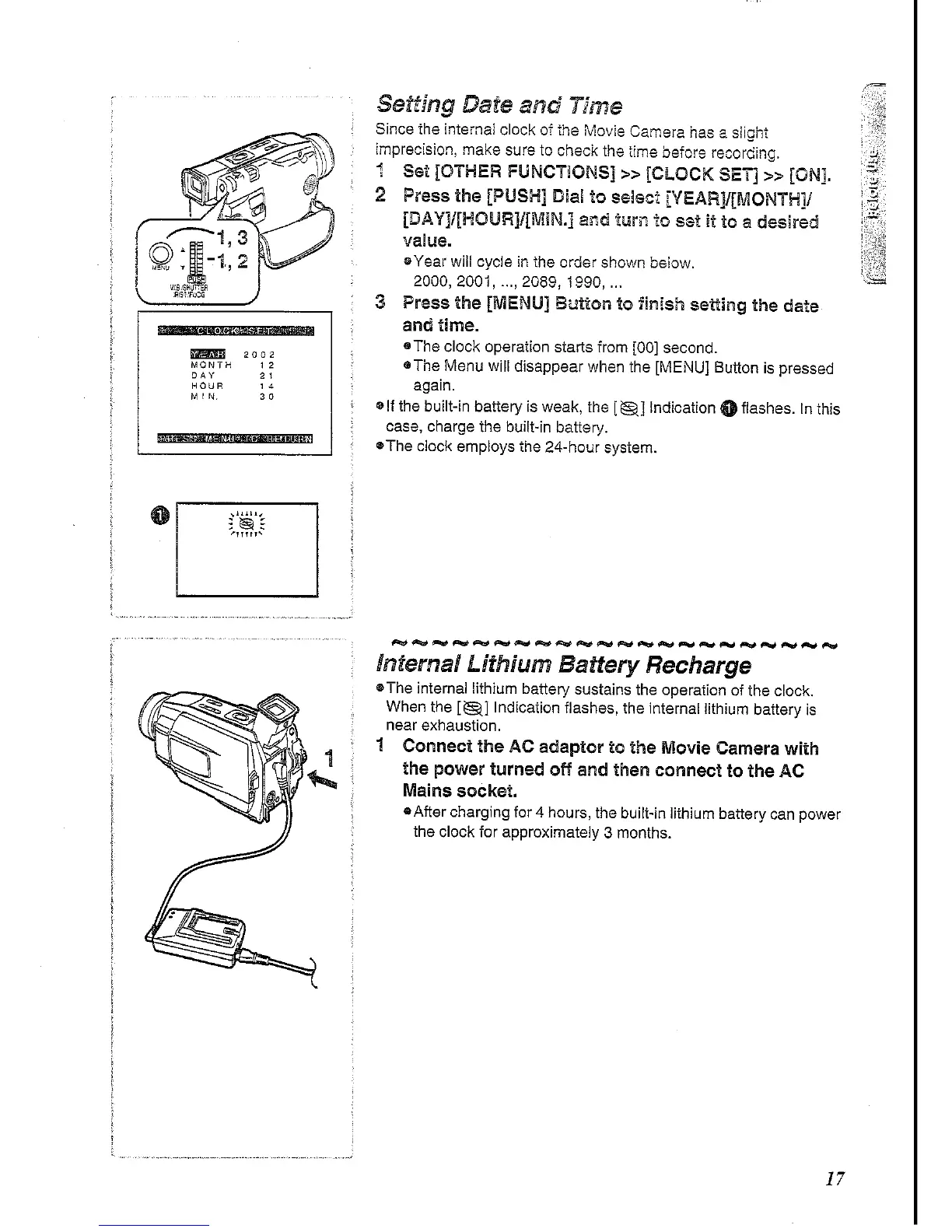 Panasonic NV-DS30 - Date, Time, and Battery Settings; Setting Date and Time; Internal Lithium Battery Recharge