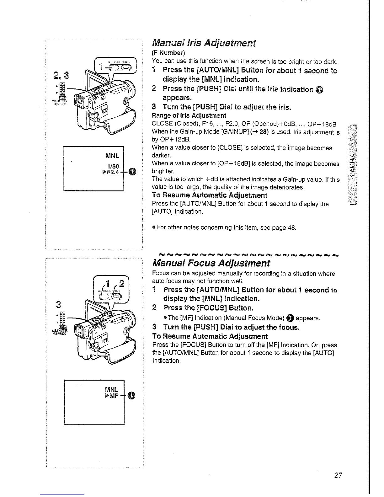 Panasonic NV-DS30 - Manual Iris and Focus Adjustment; Manual Iris Adjustment; Manual Focus Adjustment