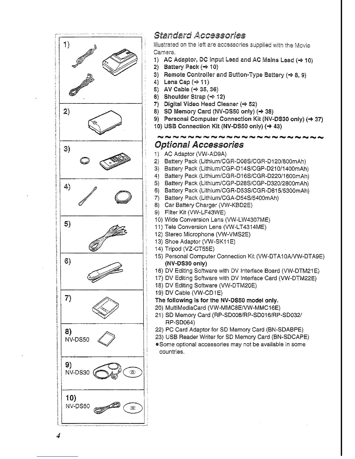 Panasonic NV-DS30 - Camera Accessories; Included Standard Accessories; Optional Accessories List