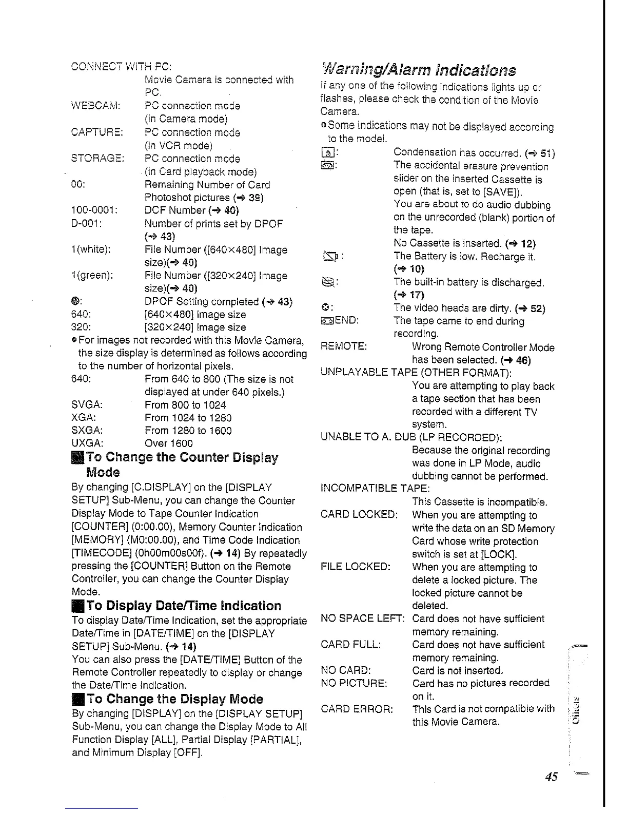 Panasonic NV-DS30 - Warning and Alarm Indications; Understanding Warnings and Alarms