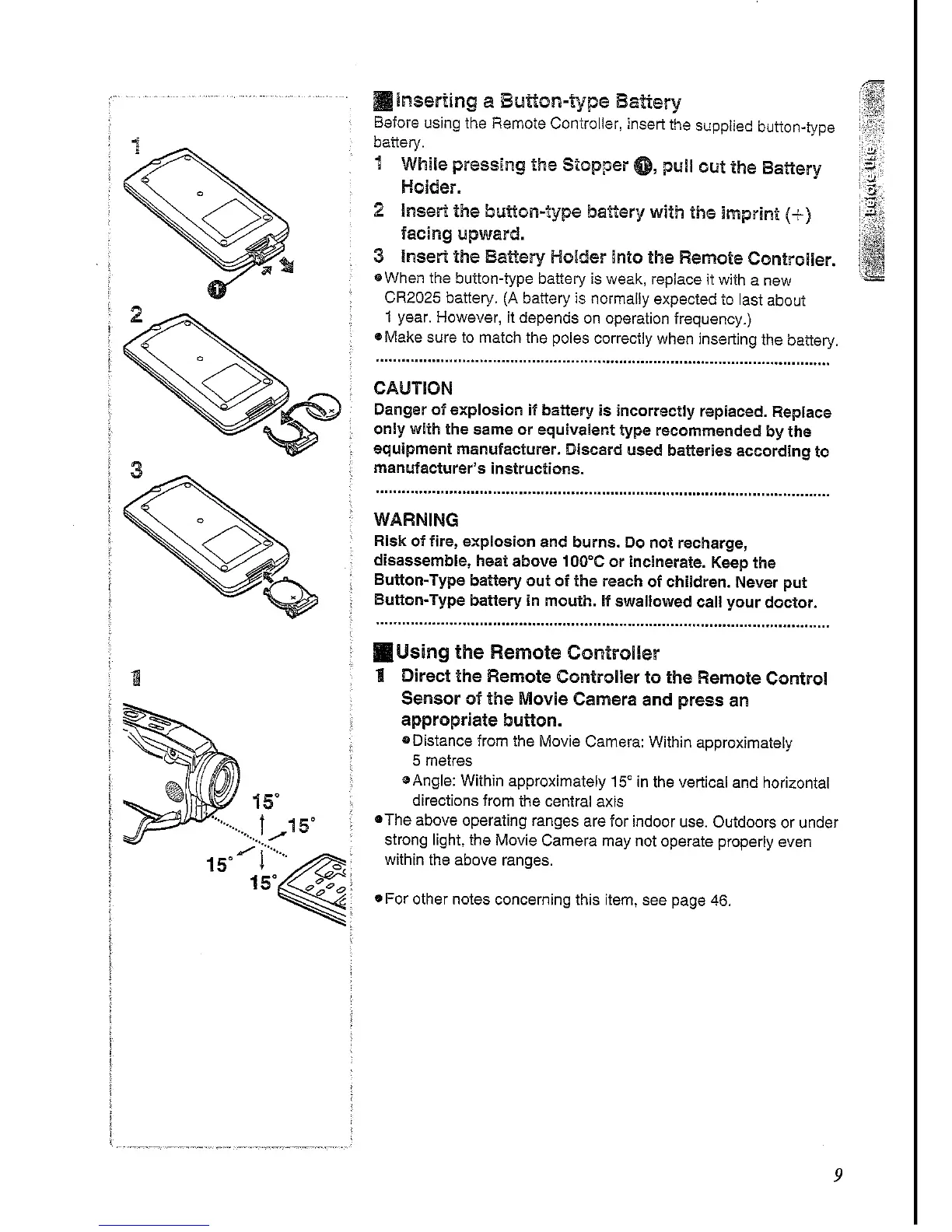 Panasonic NV-DS50 - Inserting a Button-Type Battery; Using the Remote Controller