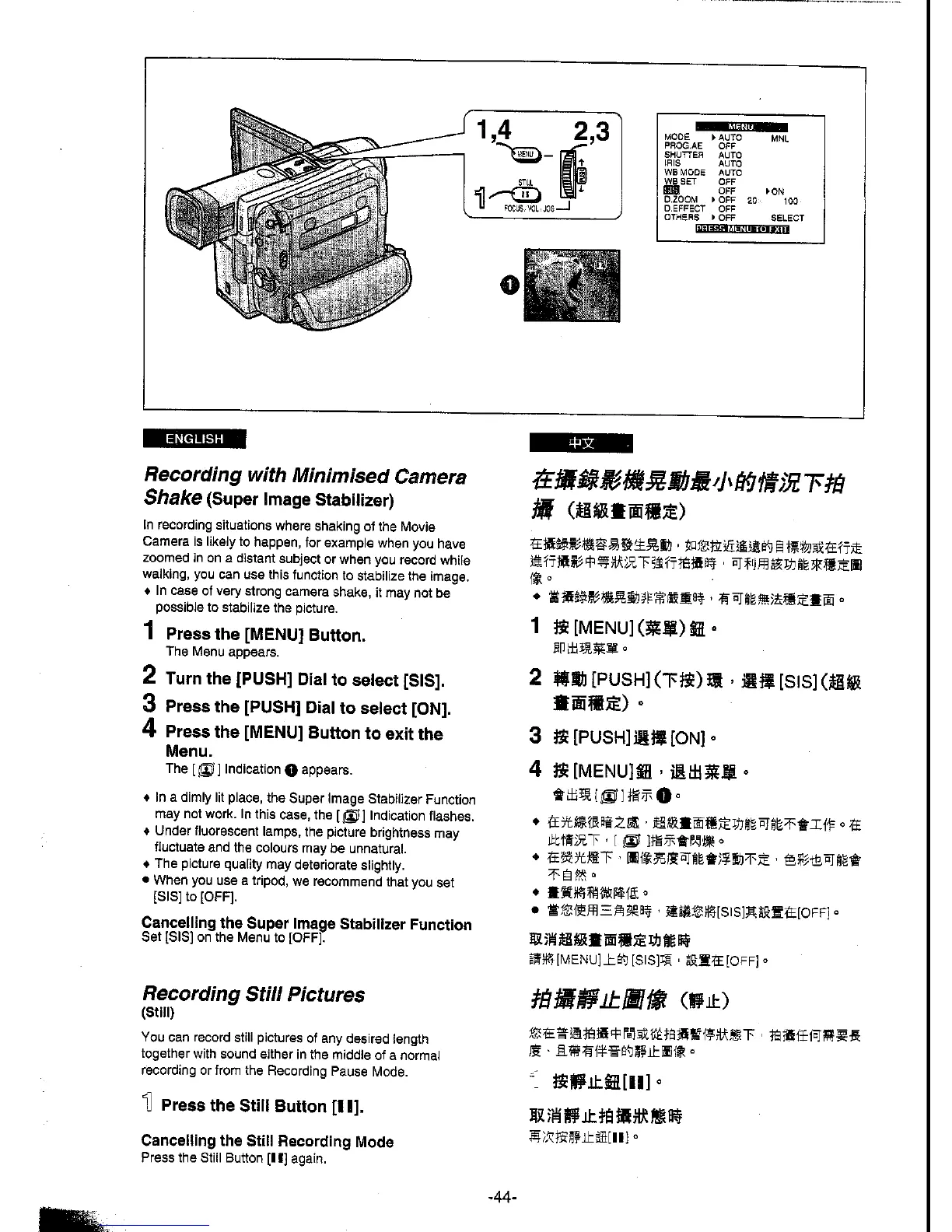 Panasonic NV-DS5EN - Recording with Minimised Camera Shake; Super Image Stabilizer; Recording Still Pictures; Cancelling the Super Image Stabilizer Function