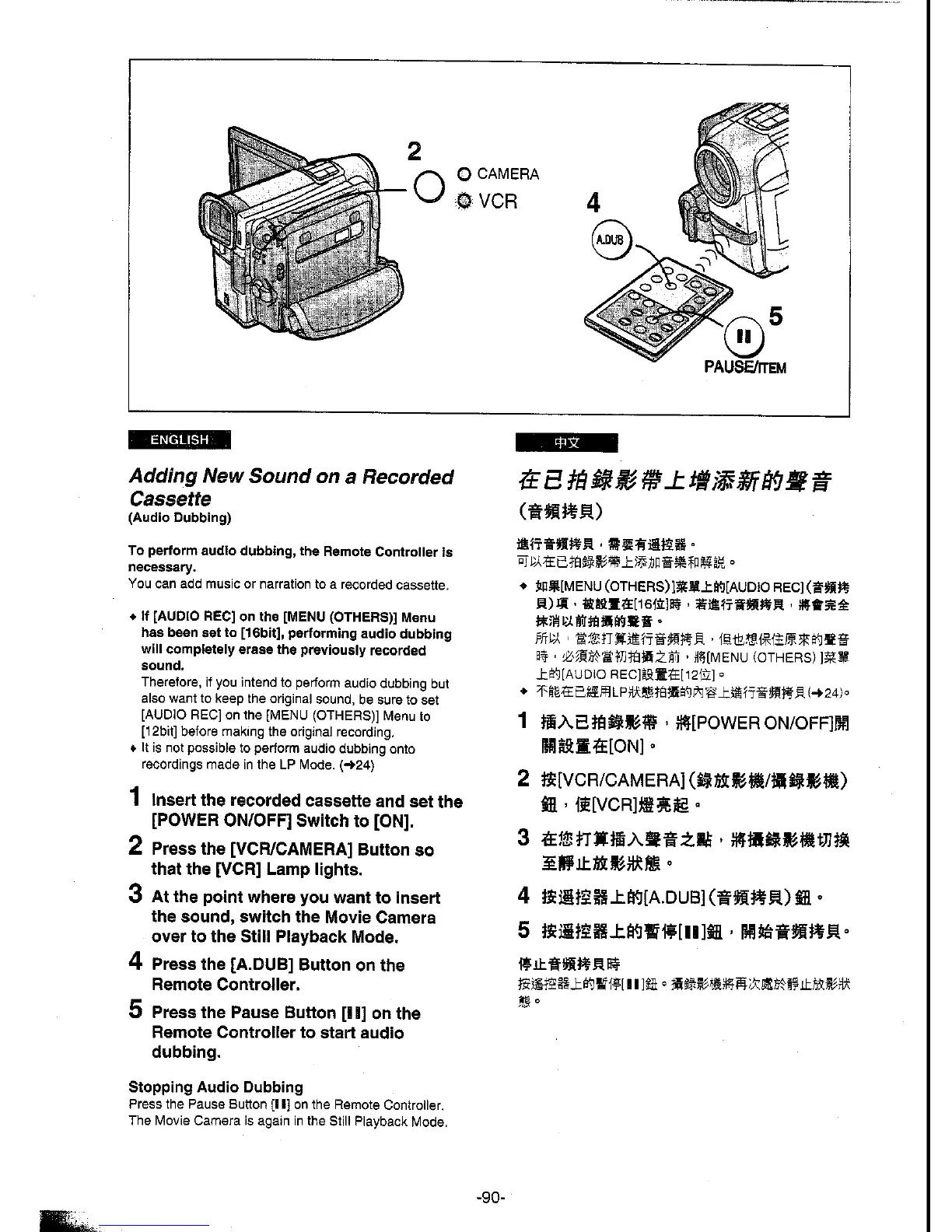 Panasonic NV-DS5EN - Adding New Sound on a Recorded Cassette; Audio Dubbing; Stopping Audio Dubbing