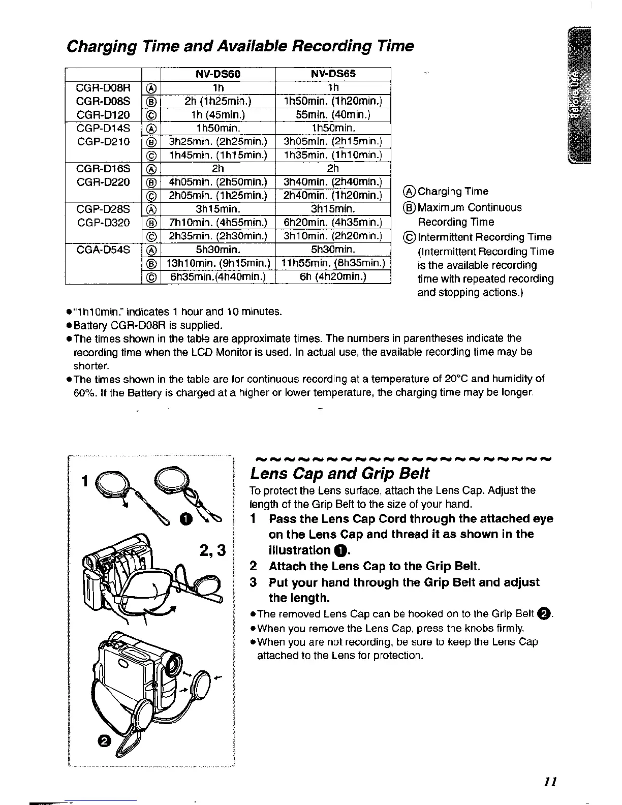 Panasonic NV-DS60A - Charging Time and Available Recording Time; Lens Cap and Grip Elt