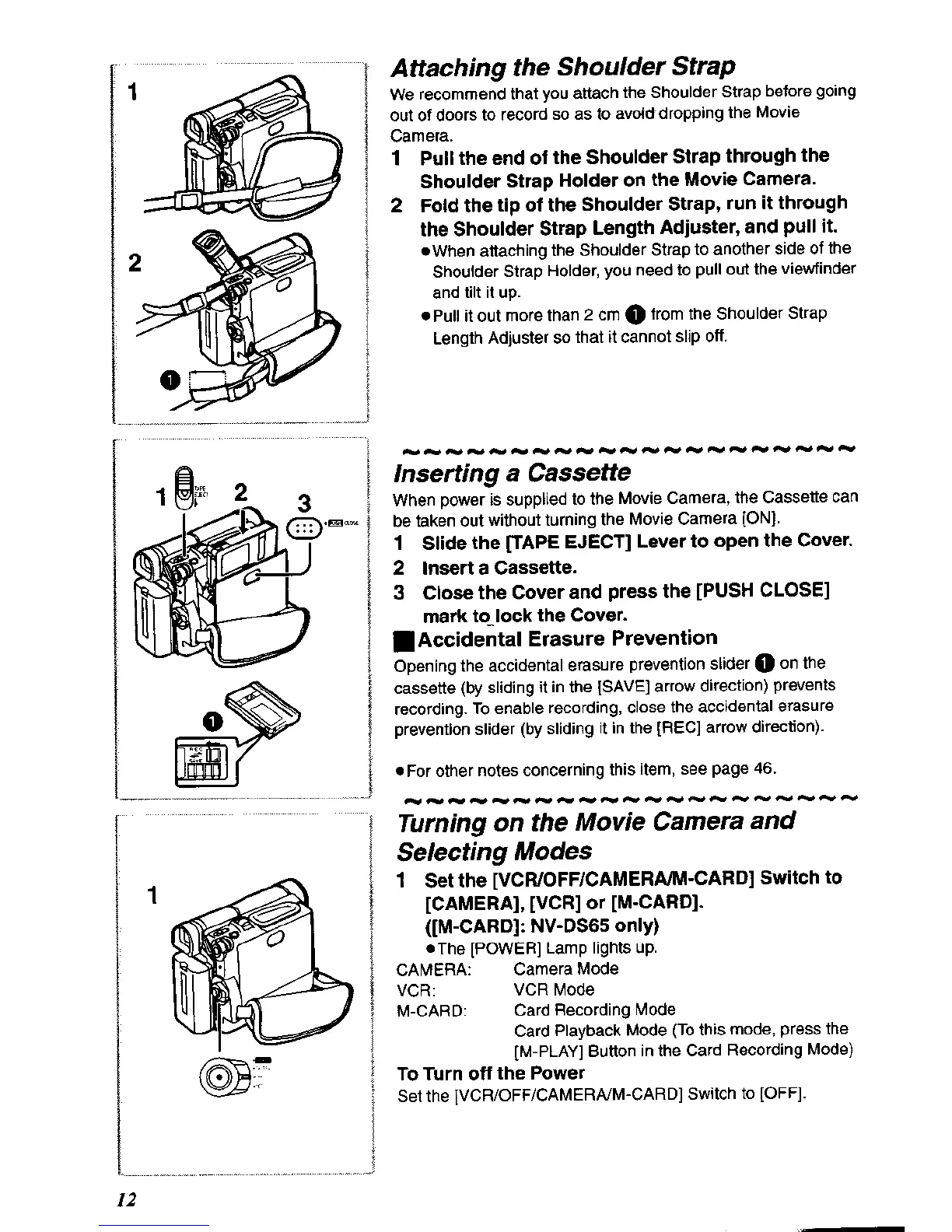 Panasonic NV-DS60A - Attaching the Shoulder Strap; Inserting a Cassette; Turning on the Movie Camera and Selecting Modes; Accidental Erasure Prevention