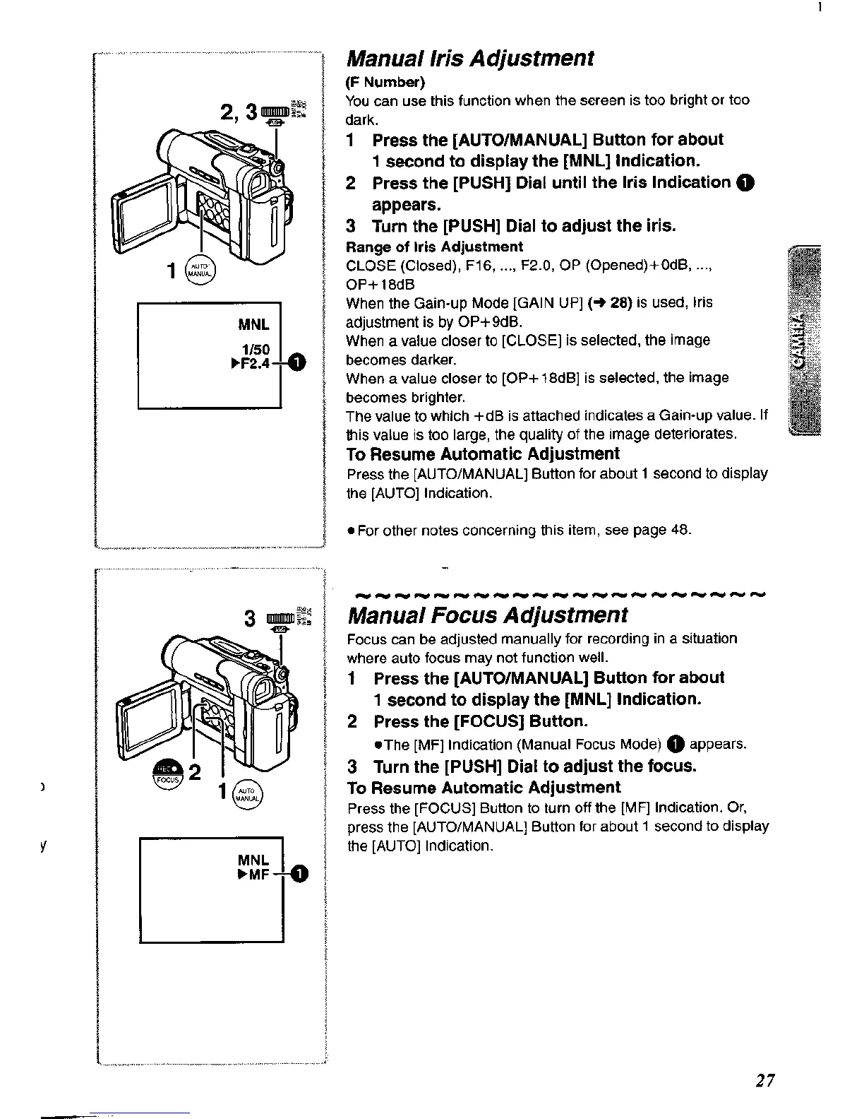Panasonic NV-DS60A - Manual Iris Adjustment; Manual Focus Adjustment