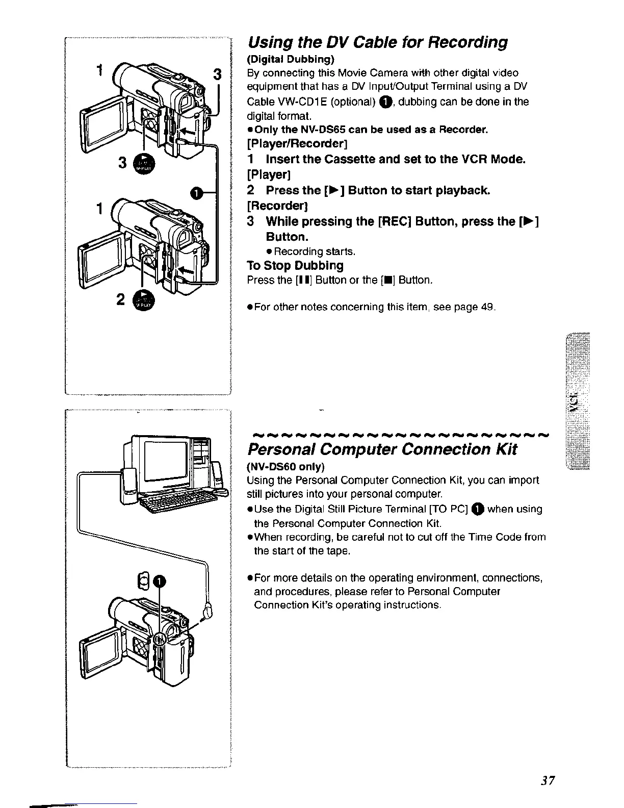 Panasonic NV-DS60A - Using the DV Cable for Recording; Personal Computer Connection Kit