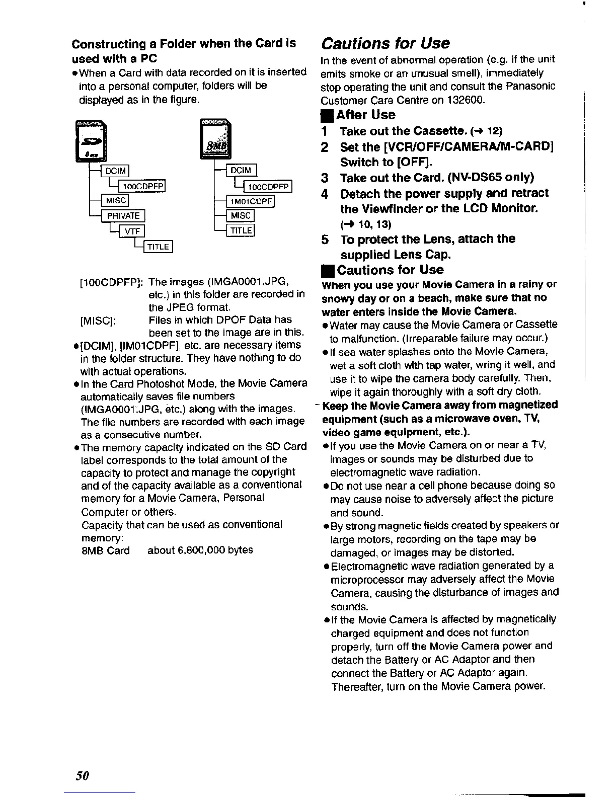 Panasonic NV-DS60A - Cautions for Use; Constructing a Folder When the Card Is Used with a PC; After Use