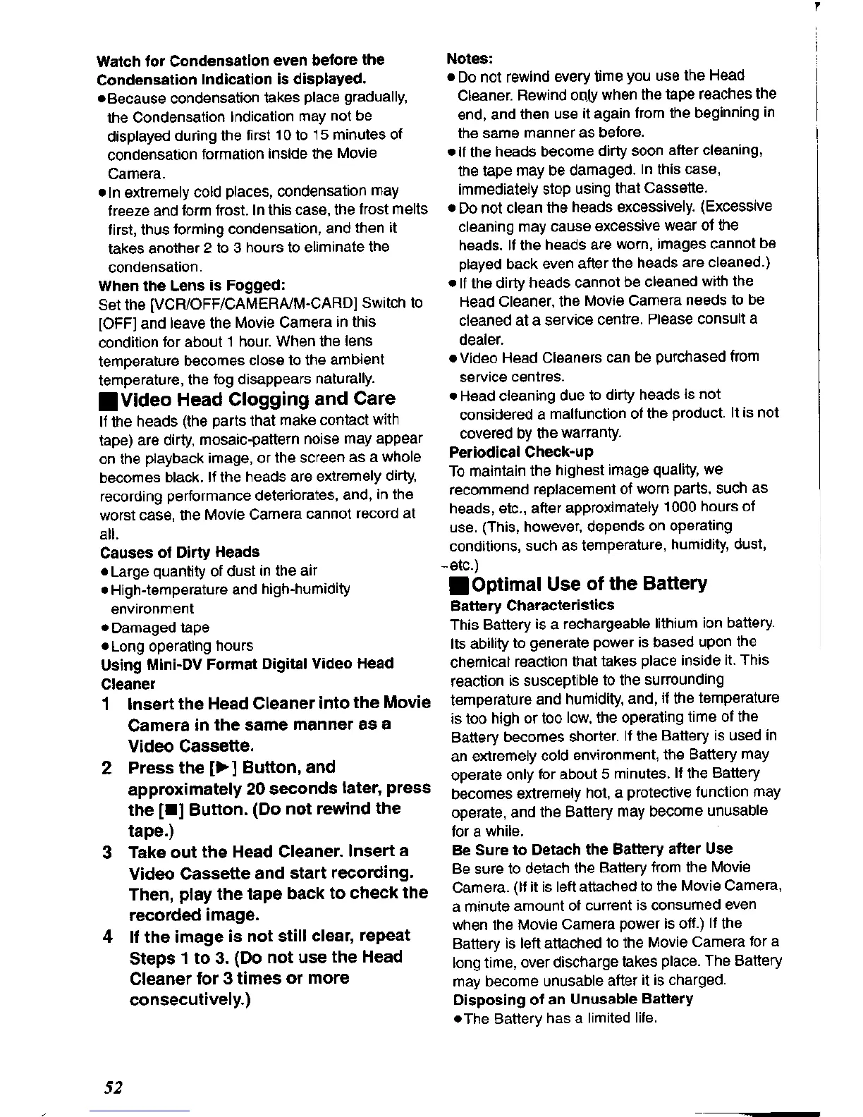 Panasonic NV-DS60A - Video Head Clogging & Care; Optimal Use of Battery