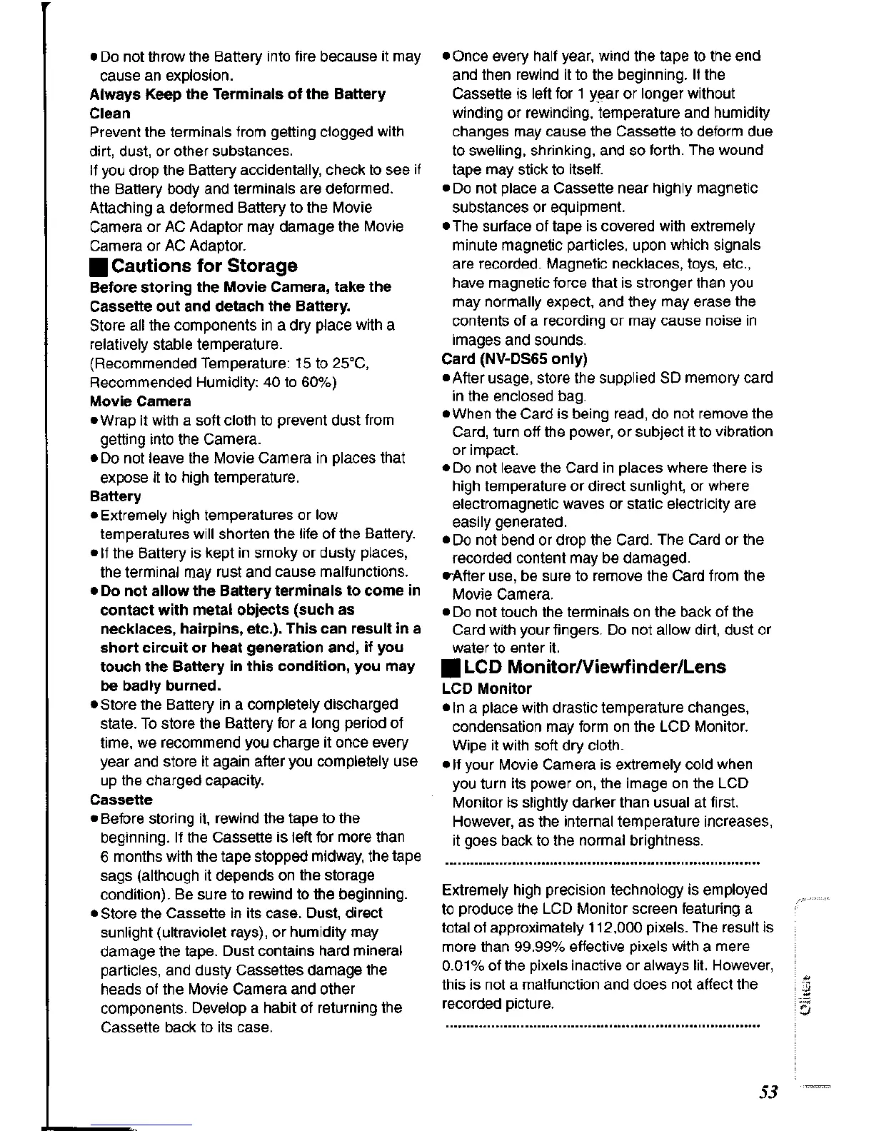 Panasonic NV-DS60A - Cautions for Storage; LCD Monitor;Viewfinder;Lens